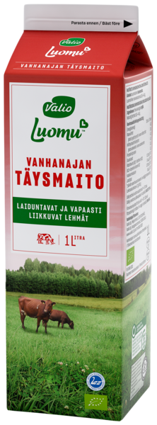 Valio Luomu™ vanhanajan täysmaito on lempeän täyteläisen makuista maitoa. Se tulee tiloilta, joissa lehmät saavat liikkua, mennä syömään ja levätä vapaasti omaan tahtiinsa pihattonavetassa ja ovat laitumella koko kesän. Nauti sellaisenaan tai käytä leivonnassa ja ruoanlaitossa. Valio Luomu™ vanhanajan täysmaidon rasvapitoisuus vaihtelee maidon luonnollisen koostumuksen mukaan. Sitä ei homogenoida, joten pieni ravistus on paikallaan ennen käyttöä. Valio Luomu™ on kestävä valinta luonnon monimuotoisuuden puolesta. Tutustu myös muihin Valio Luomu™ tuotteisiin!