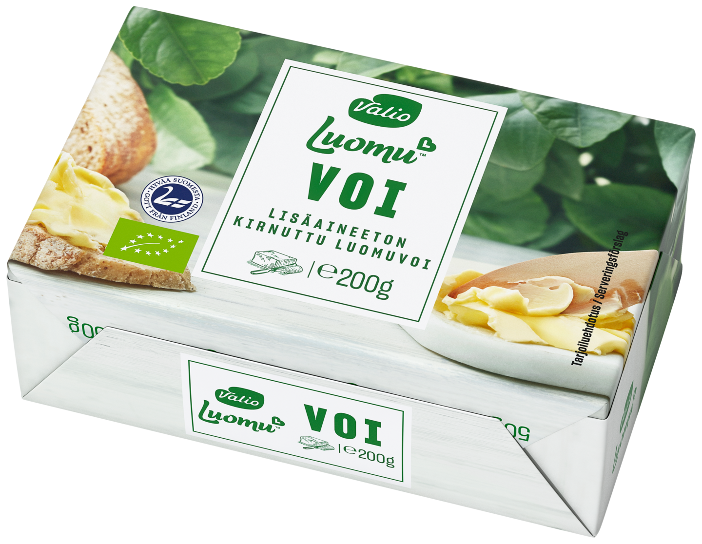 Valio Luomu™ voi on valmistettu perinteisesti kirnuamalla puhtaasta suomalaisesta luomukermasta, ilman lisäaineita. Sen valmistuksessa on käytetty ainoastaan luomukermaa ja suolaa. Luomuvoin hieno ja aromikas maku sopii erinomaisesti ruuanlaittoon ja leivontaan. Se kruunaa myös uudet perunat ja hyvän leivän. Valio Luomu™ on kestävä valinta luonnon monimuotoisuuden puolesta. Tutustu myös muihin Valio Luomu™ tuotteisiin!