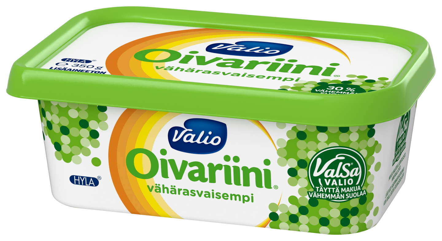 Kevyempi valinta on helppo tehdä, kun mausta ei tarvitse tinkiä. Valio Oivariini® vähärasvaisempi sisältää vähemmän rasvaa ja suolaa mutta on silti täynnä tuttua herkullista makua. Pienempi suolapitoisuus onnistuu, kun osa tavallisesta suolasta korvataan Valio ValSa® maitosuolalla eli maidon luontaisilla mineraaleilla. Sipaise leivälle, käytä ruuanlaitossa tai leivonnassa – ja nauti. Kaikki Valio Oivariini® tuotteet valmistetaan aina tuoreesta suomalaisesta voista ja pehmeästä rapsiöljystä ilman lisäaineita ja säilöntäaineita. Ne ovat luonnollinen valinta koko perheelle.