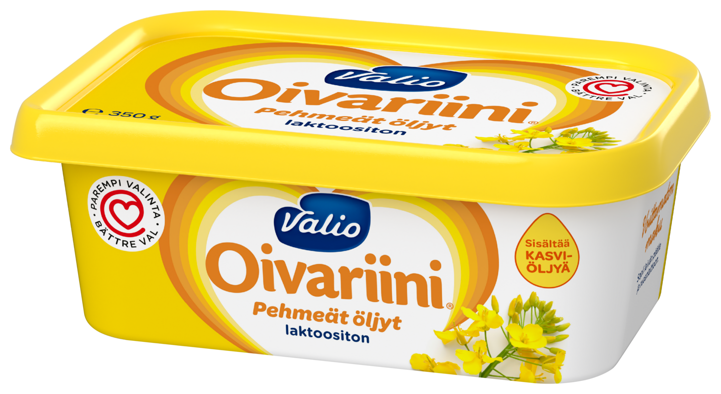 Valio Oivariini® pehmeät öljyt levite sisältää runsaasti pehmeitä kasviöljyjä. Tuotteelle on myönnetty Sydänmerkki, joka kertoo tuoteryhmässään paremmasta valinnasta rasvojen laadun ja suolan määrän suhteen. Se sisältää myös runsaasti omega-3-rasvahappoja. Levitä lempeydellä leivän päälle tai käytä ruoanlaitossa tukemaan terveellistä elämäntapaa ja laadukkaiden rasvojen saantia. Lisäsimme mukaan myös tuoretta voita takaamaan herkullisen maun. Kaikki Valio Oivariini® tuotteet valmistetaan ilman säilöntäaineita. Ne ovat helppo valinta koko perheelle. Tuote on laktoositon.