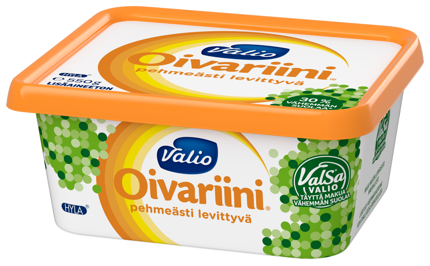 Valio Oivariini® pehmeästi levittyvä on hyvä valinta, kun elämässä riittää nopeita tilanteita ja tarvitaan myös nopeita eväitä. Leivän päälle pehmeästi levittyvä Oivariini® sisältää myös vähemmän suolaa, sillä korvasimme osan tavallisesta suolasta Valio ValSa® maitosuolalla eli maidon luontaisilla mineraaleilla. Sipaise leivälle, käytä ruuanlaitossa tai leivonnassa – ja nauti. Kaikki Valio Oivariini® tuotteet valmistetaan aina tuoreesta suomalaisesta voista ja pehmeästä rapsiöljystä ilman lisäaineita ja säilöntäaineita. Ne ovat luonnollinen valinta koko perheelle.