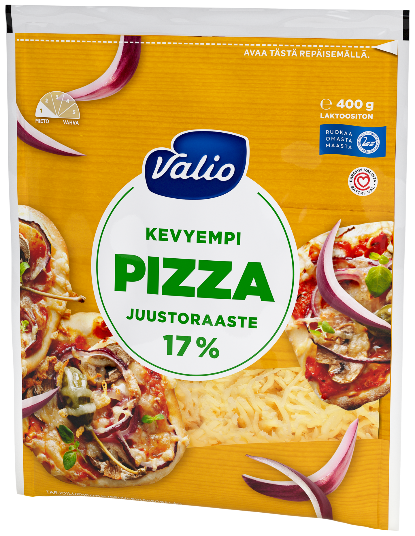 LaktoositonValmiiksi raastettu juusto tuo huolettomuutta ruoanlaittoon. Valio kevyempi pizzajuustoraaste on kevyempi vaihtoehto esimerkiksi pizzan päälle. Rasvapitoisuus 17 %.