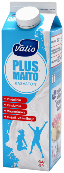 Valio Plus™ rasvaton maito on erinomainen valinta ruokajuomaksi, koska se sisältää runsaasti hyvälaatuista maitoproteiinia, kalsiumia ja D-vitamiinia. Se on lisäksi magnesiumin, B-vitamiinien ja kaliumin lähde. Valio Plus™ rasvaton maito sopii koko perheelle ja on erityisen hyvä valinta kevyeen ruokavalioon, liikkujille, ikäihmisille ja kasvaville nuorille osana terveellistä ruokavaliota.