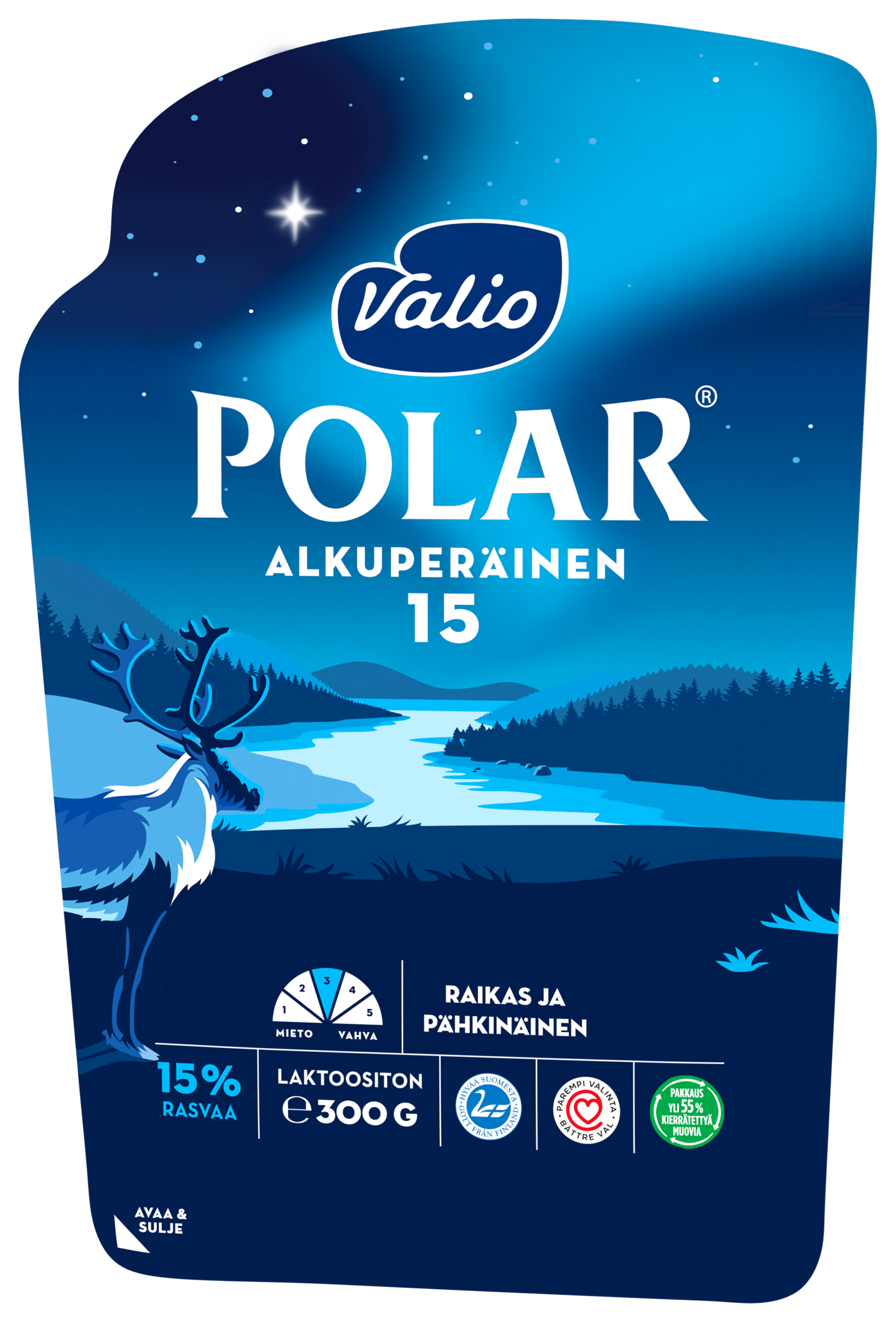 LaktoositonValio Polar® on omaleimainen asennejuusto. Siinä yhdistyvät pohjoinen elämä ja vahvuus tavalla, johon tavalliset juustot eivät pysty. Valio Polar® Alkuperäinen 15 % on luonteikas ja pähkinäinen juusto, joka maistuu valmiina viipaleina leivän päällä ja sellaisenaan naposteltuna. Saatavilla palana ja viipaleina. Valio Polar® on saanut innoituksensa pohjoisesta luonnosta, joka ei tunne kompromisseja. Se on juusto, jonka maku on samaan aikaan voimakas ja lempeä. Saatavilla palana ja viipaleina.