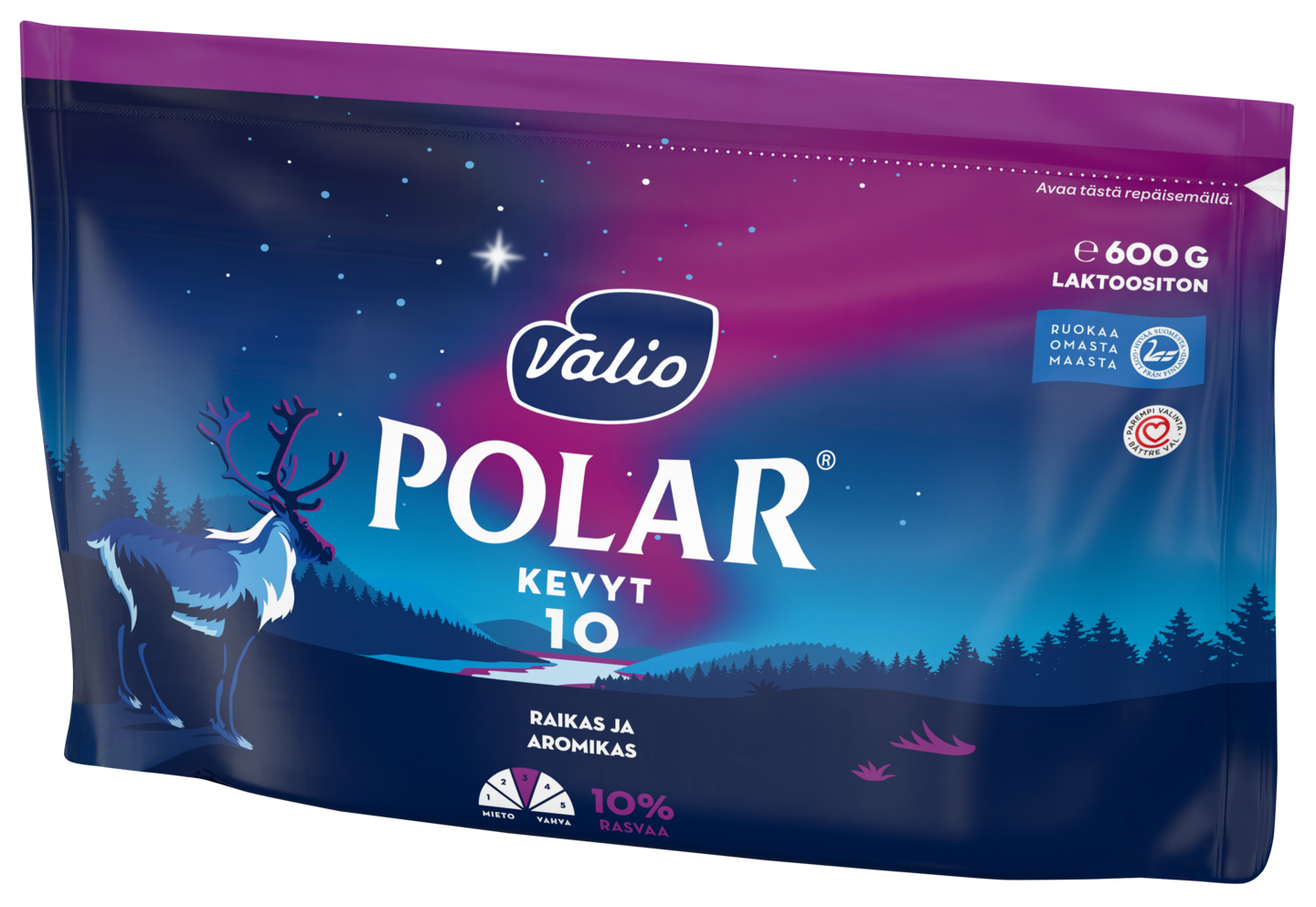 LaktoositonValio Polar® on saanut innoituksensa pohjoisesta luonnosta, joka ei tunne kompromisseja. Sen maku on samaan aikaan voimakas ja lempeä. Valio Polar® Kevyt 10 % juustossa on runsaasti makua, vaikka siinä on rasvaa vain 10 prosenttia. Tämä raikas ja aromikkaan makuinen kevytjuusto sopii hyvin leivän päälle ja kylmiin ruokiin kuten salaatteihin tai cocktailpaloihin. Valio Polar® Kevyt 10 % juustolle on myönnetty Sydänmerkki. Se sisältää runsaasti proteiinia ja kalsiumia ja on hyvä valinta myös sellaisenaan naposteltavaksi välipalaksi. Saatavilla myös viipaleina.
