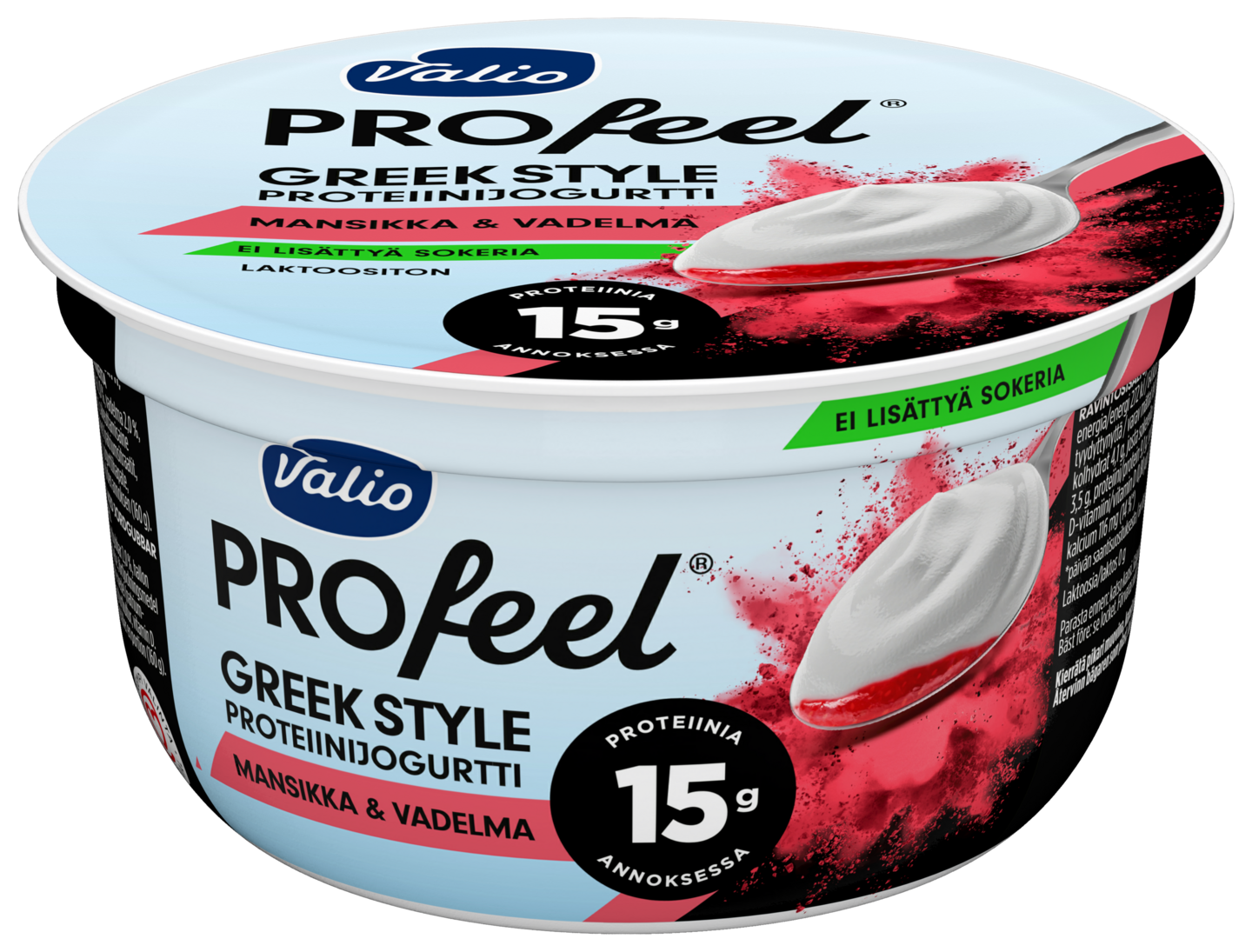 Pidä huolta hyvinvoinnistasi joka lusikallisella! Valio PROfeel® Greek Style mansikka-vadelma yhdistää täyteläisen kreikkalaistyyppisen proteiinijogurtin ja marjaisan mansikka-vadelmakastikkeen samaan annokseen. Tämä vähärasvainen ja sydänmerkitty proteiinijogurtti on täydellinen valinta niin aamupalalle kuin päivän muihinkin hetkiin. Annos sisältää 15 grammaa korkealaatuista proteiinia, joka tukee aktiivista elämäntapaa. Nauti herkullisesta mausta ilman lisättyä sokeria. Tuote on laktoositon.