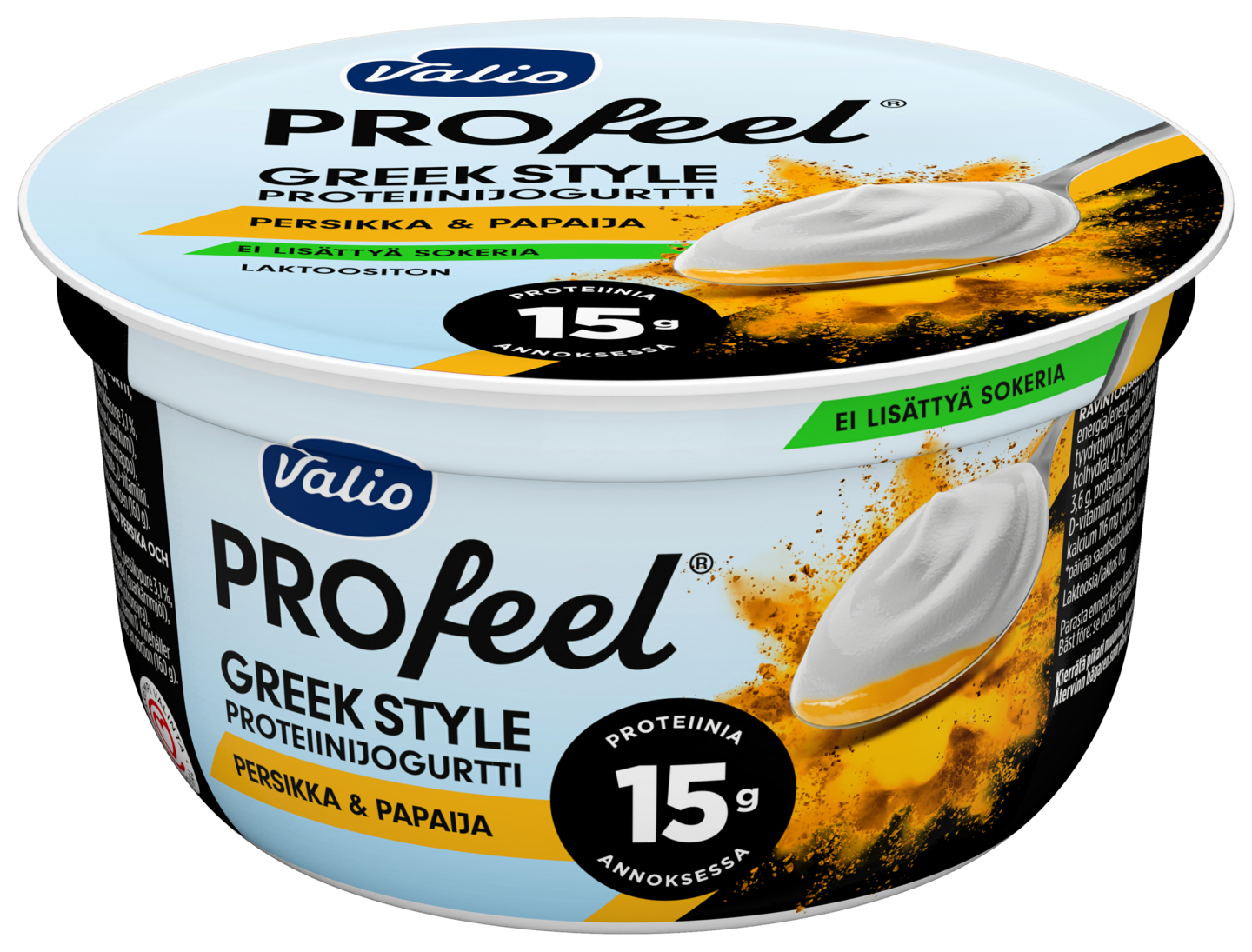 LaktoositonPidä huolta hyvinvoinnistasi joka lusikallisella! Valio PROfeel® Greek Style persikka-papaija yhdistää täyteläisen kreikkalaistyyppisen proteiinijogurtin ja mehukkaan persikka-papaijakastikkeen samaan annokseen. Tämä vähärasvainen ja sydänmerkitty proteiinijogurtti on täydellinen valinta niin aamupalalle kuin päivän muihinkin hetkiin. Annos sisältää 15 grammaa korkealaatuista proteiinia, joka tukee aktiivista elämäntapaa. Nauti herkullisesta mausta ilman lisättyä sokeria. Tuote on laktoositon.