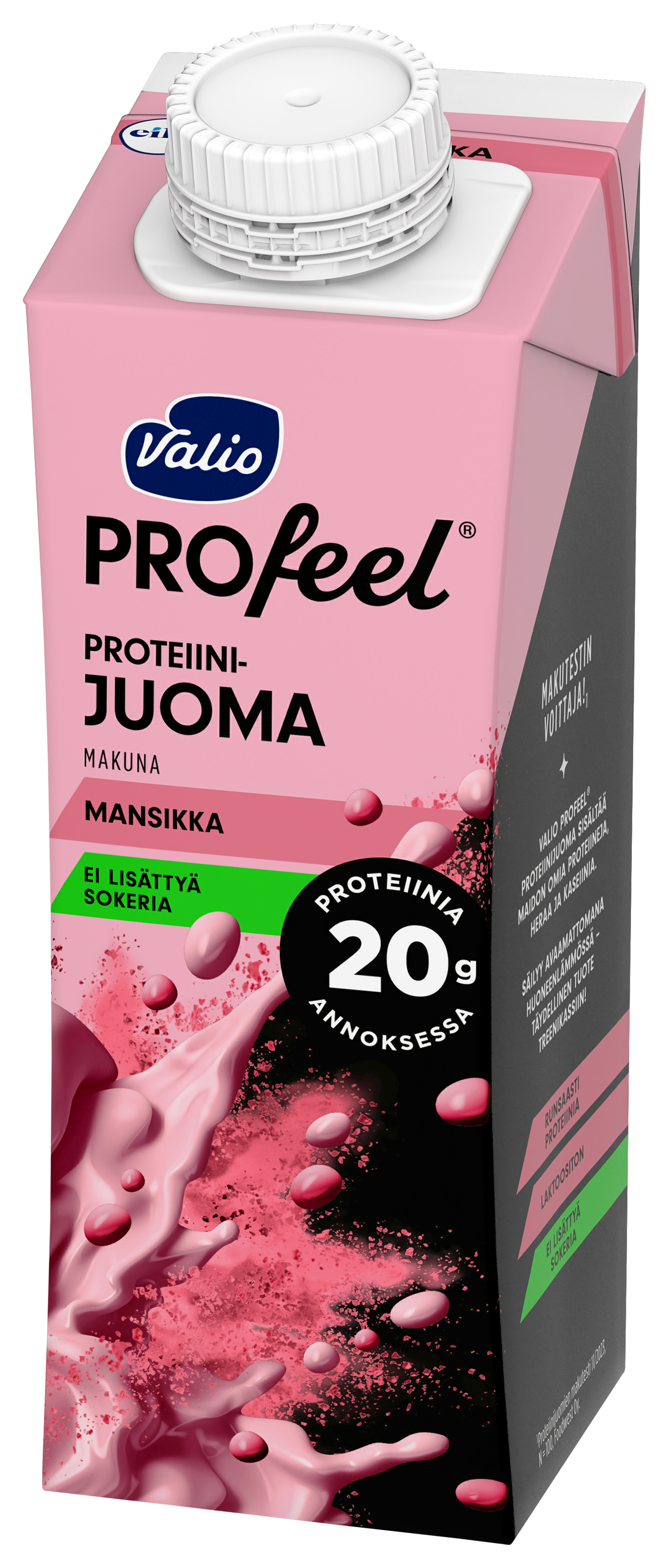 LaktoositonRuoki tavoitteitasi herkullisesti, ilman lisättyä sokeria! Valio PROfeel® proteiinijuoma mansikkainen on välipalajuoma, joka on helppo napata mukaan vaikka treenikassiin. Yhdessä pakkauksessa on 25 g laadukasta maitoproteiinia, joka sisältää kaikki elimistön tarvitsemat yhdeksän välttämätöntä aminohappoa samassa paketissa. Kokeile myös muita maukkaita Valio PROfeel® proteiinijuomia!