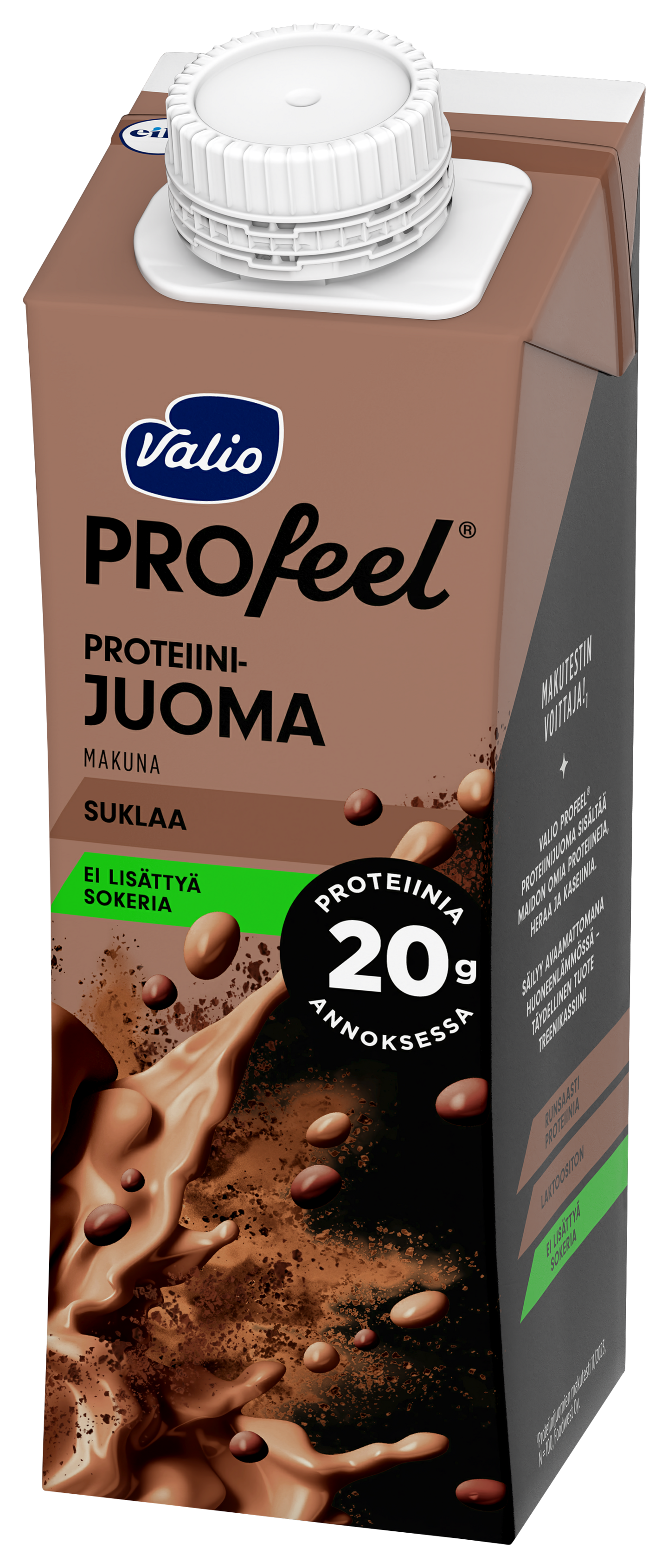 LaktoositonRuoki tavoitteitasi herkullisesti, ilman lisättyä sokeria! Valio PROfeel® proteiinijuoma suklaa on välipalajuoma, joka on helppo napata mukaan vaikka treenikassiin. Yhdessä pakkauksessa on 25 g laadukasta maitoproteiinia, joka sisältää kaikki elimistön tarvitsemat yhdeksän välttämätöntä aminohappoa samassa paketissa. Kokeile myös muita maukkaita Valio PROfeel® proteiinijuomia!