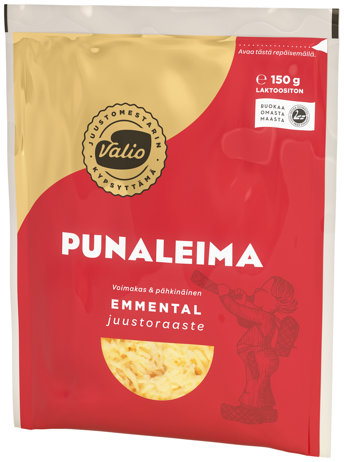 LaktoositonValio Emmental punaleima juustoraaste on voimakasta ja aromaattista emmentaljuustoa kätevänä raasteena. Juustomestarimme kypsyttävät Valio Emmental punaleimaa perinteisellä emmental-reseptillä aina vähintään 6 kuukautta. Maultaan se on voimakas ja pähkinäinen ja antaa täyteläistä makua esimerkiksi kuorrutuksiin, kastikkeisiin ja suolaiseen leivontaan. Saatavilla palana, viipaleina ja valmiina raasteena.