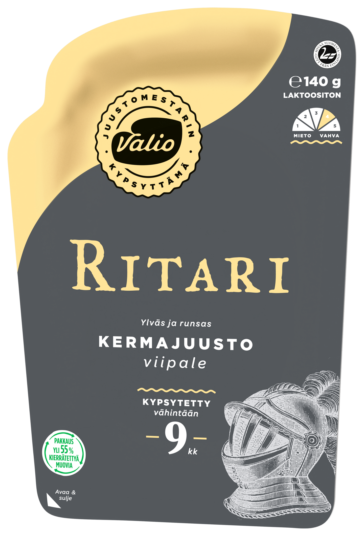 LaktoositonValio Ritari® nyt myös viipaleina! Valmiiksi viipaloitu herkuttelujuusto tekee arjestakin juhlaa kruunaten leipäsi kermaisella täyteläisyydellään. Valio Ritari® on luoteikas kermajuusto, jota kypsytetään aina vähintään yhdeksän kuukautta. Sen maku on ylväs, runsas ja voimakas. Ritari kermajuuston suussasulava pehmeys ja mieto happamuus sopii täydellisesti hyvän leivän seuraan, herkutteluun, juustotarjottimelle ja salaatteihin. Maukasta myös fonduessa.