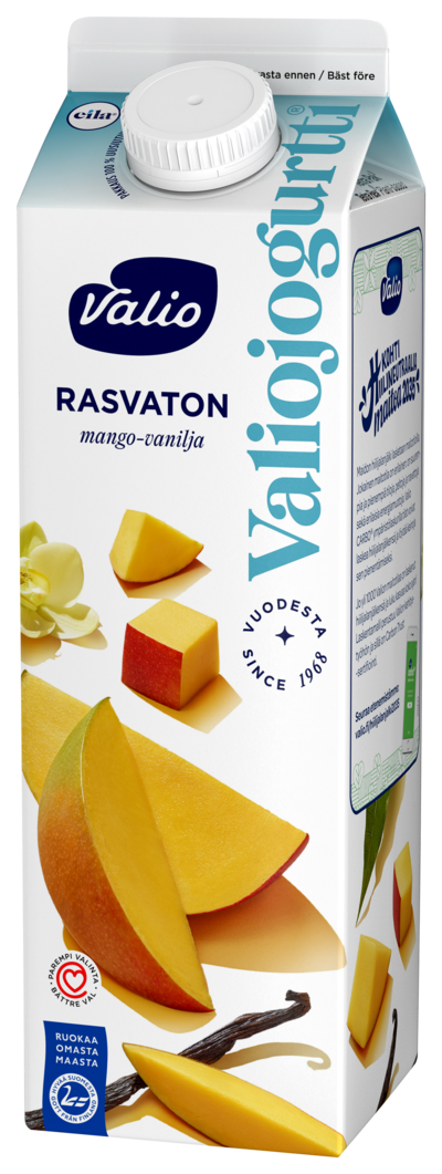 LaktoositonRakastettu Valiojogurtti® rasvattomana! Herkullisen pehmeä Valiojogurtti® rasvaton mango-vaniljajogurtti maistuu raikkaasti suomalaiselta maidolta ja tuoreilta hedelmiltä. Tuotteelle on myönnetty Sydänmerkki. Valiojogurtti® on klassikko jo vuosien takaa ja yhä edelleen Suomen suosituin jogurtti. Koko Valiojogurtti® tuoteperhe on laktoositon. Vanhojen tuttujen makujen rinnalle tulee jatkuvasti myös uusia makuja kuten vaihtuvat Makuja maailmalta -jogurtit.