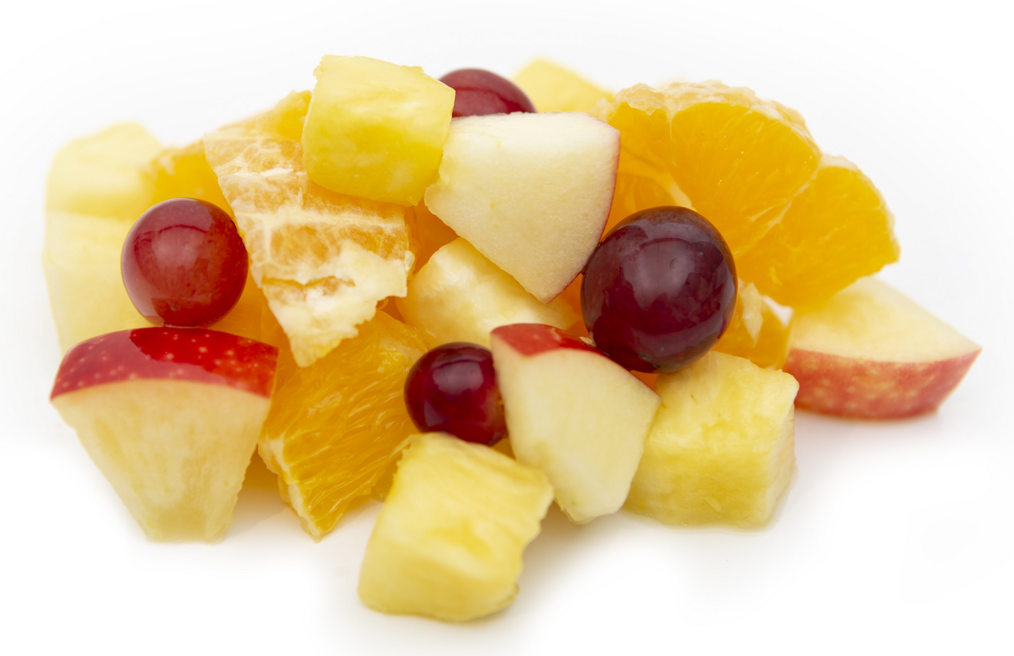 Valmix Hedelmäsalaatti on mehukas sekoitus appelsiinia, omenaa, ananasta ja viinirypäleitä. Omenan hapettumisenestoaine E300, happamuudensäätöaine E501.