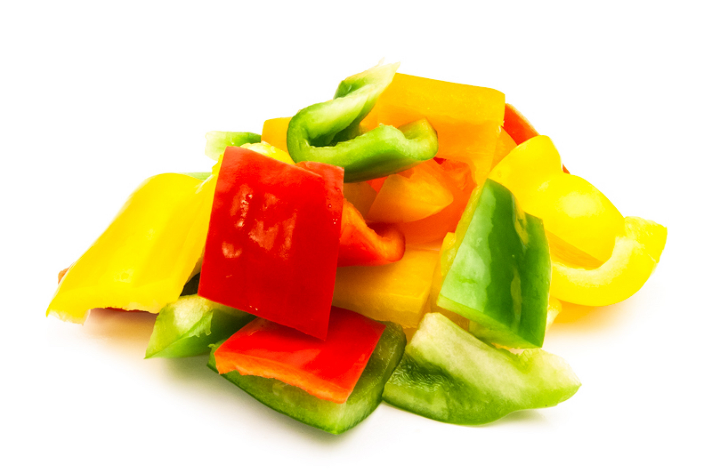 Valmix Paprikalohko mix on tuoretta punaista, keltaista ja vihreää paprikaa lohkoksi leikattuna, kooltaan noin 2-3 x 2-3 cm.