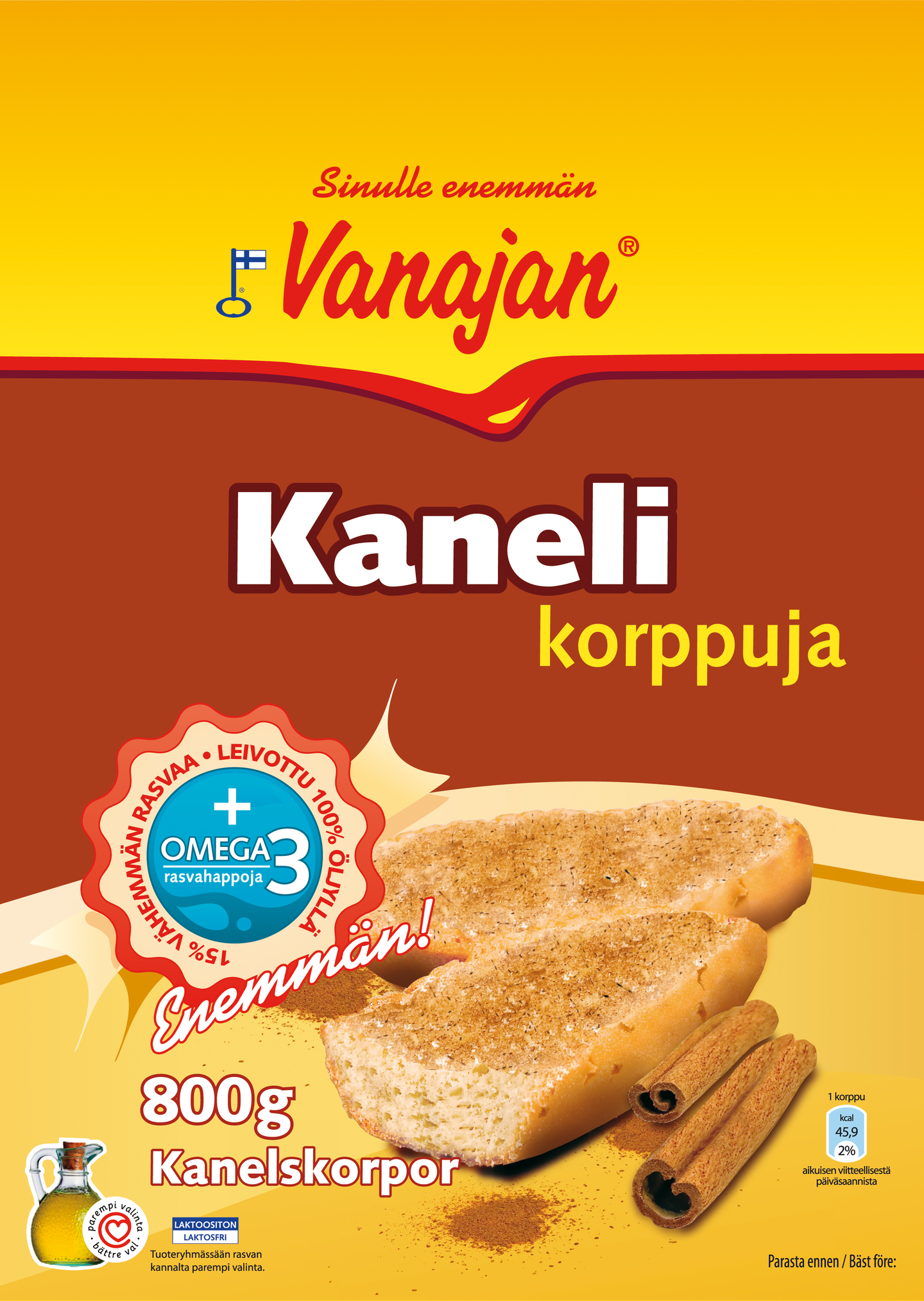 VEHNÄjauho, sokeri, rypsiöljy, hiiva, kaneli, suola, emulgointiaine (rypsilesitiini). Säilytetään huoneenlämpötilassa, suojattava auringolta. Laktoositon. Ei sisällä maidon ainesosia.