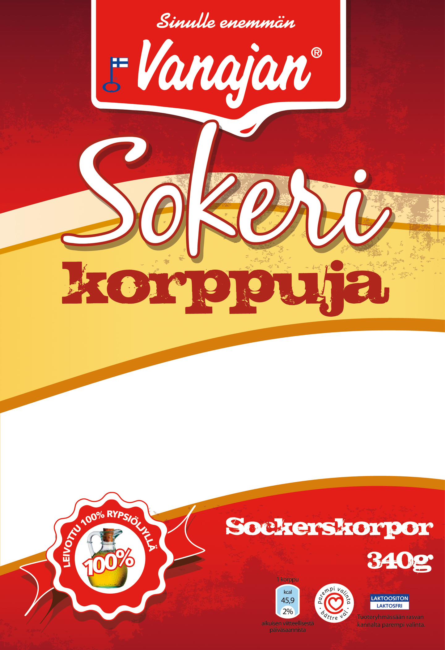 VEHNÄjauho, sokeri, rypsiöljy, hiiva, suola, emulgointiaine (rypsilesitiini). Säilytetään huoneenlämpötilassa, suojattava auringolta. Laktoositon. Ei sisällä maidon ainesosia.