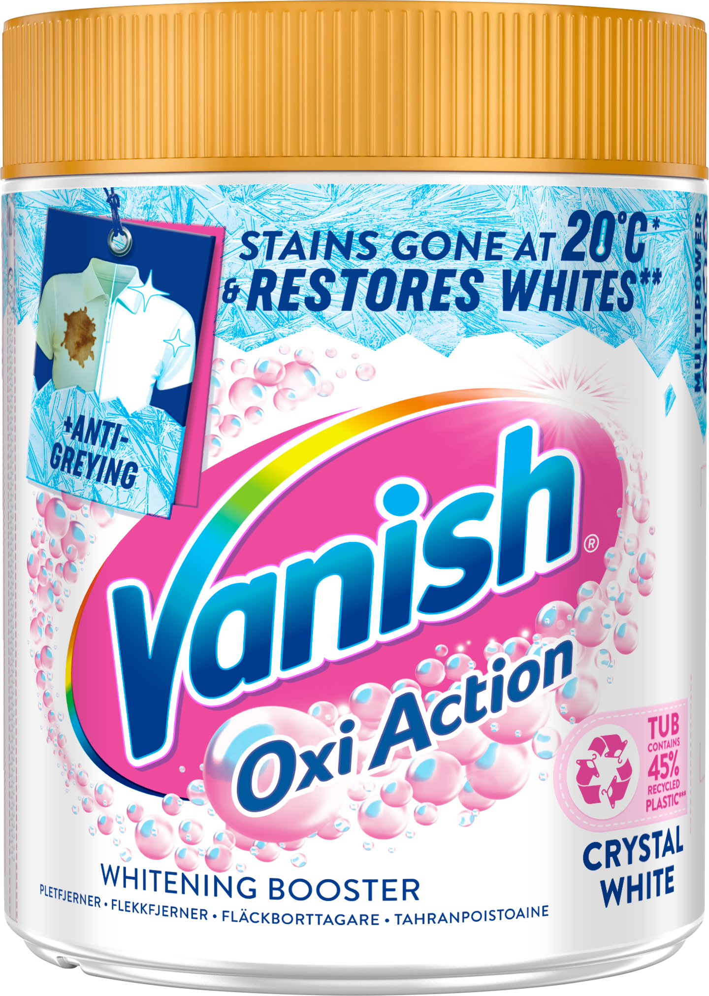 Vanish Multi Power Crystal White -jauheessa yhdistyvät tehokkaan valkaisujauheen ja tahranpoistajan parhaat puolet. Se poistaa tehokkaasti kaiken tyyppiset sitkeät tahrat. Se irrottaa sekä näkyvät että piilossa olevat vaikeat ja materiaaliin imeytyneet tahrat. Vaatteiden pitäminen tahrattomina on helpompaa kuin uskotkaan – lisää vain mittalusikallinen jokaiseen pesuun.Luota pinkkiin ja palauta kirkkaan valkoinen väri!* verrattuna harmaantuneisiin tekstiileihin Tulokset saattavat vaihdella
