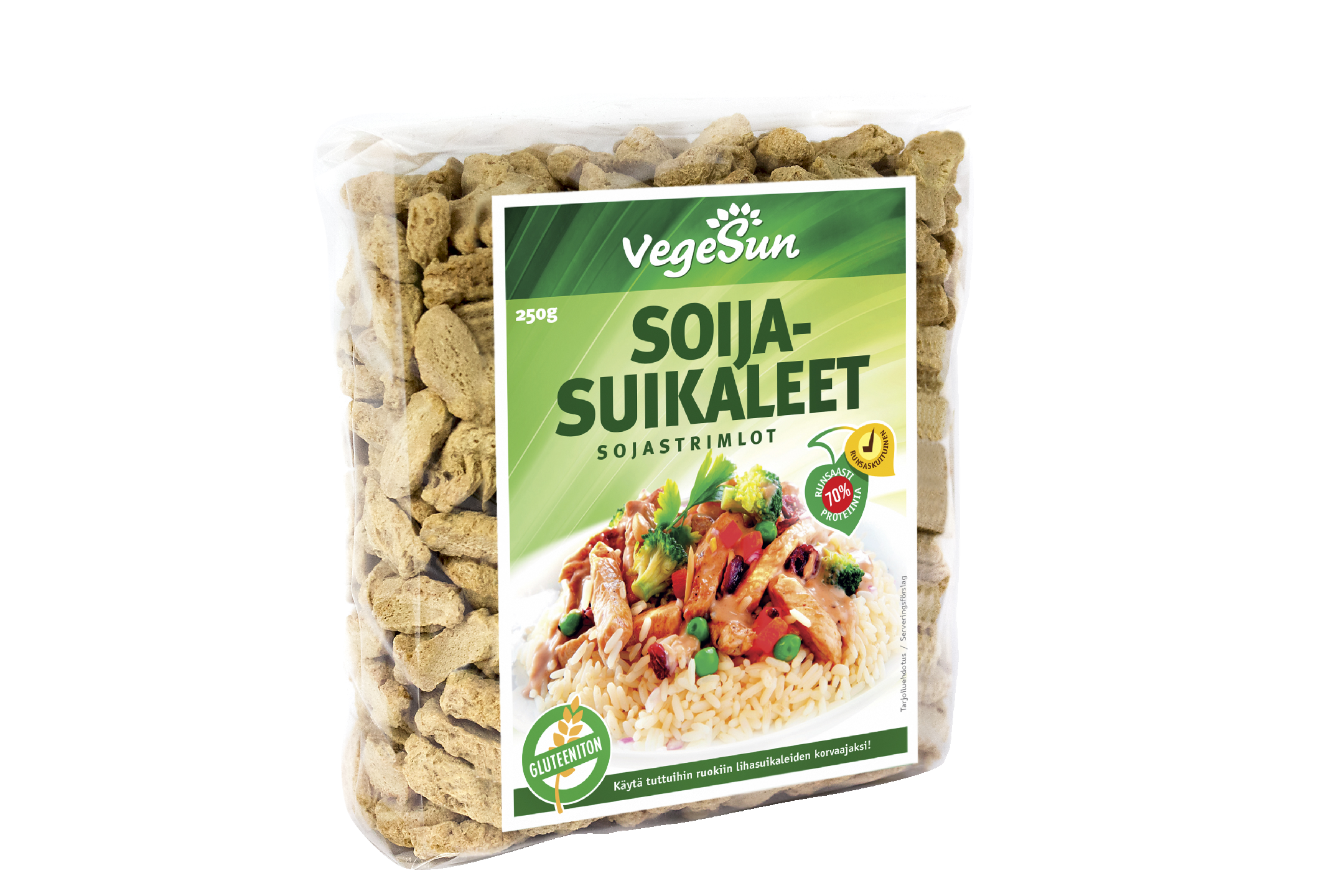 VegaaninenSoijasuikaleet on tehty Eurooppalaisesta soijasta. Sisältää paljon proteiinia, 70%, ja on tietenkin geenimuuntelematon. Kiinteät, lihaa tai kanaa muistuttavat soijasuikaleet ovat suosittuja erinomaisen rakenteensa ansiosta. Käytä niitä kuten kanasuikaleita wokeissa, pataruuissa ja kastikkeissa.