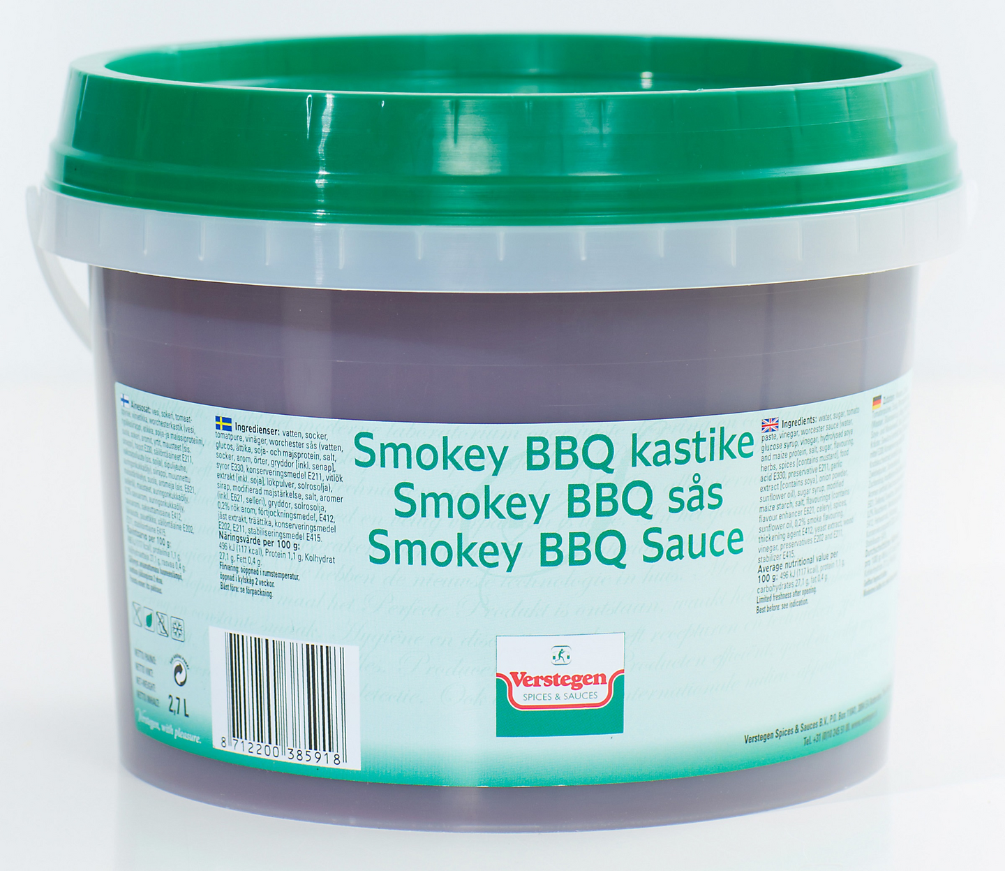 vesi, sokeri, tomaattipyree, etikka, worchester-kastike (vesi, rypälesiirappi, etikka, SOIJA- ja maissiproteiini, suola, sokeri, aromit, yrtit, mausteet (sis. SINAPPI), hapot E330, säilöntäaineet E211, valkosipuliuute, sipulijauhe, auringonkukkaöljy), siirappi, muunnettu maissitärkkelys, suola, aromeja (sis. SELLERI), mausteet, auringonkukkaöljy, savuaromi 0,2%, sakeuttamisaine E412, puuetikka, säilöntäaineet E202, E211, stabilointiaine E415