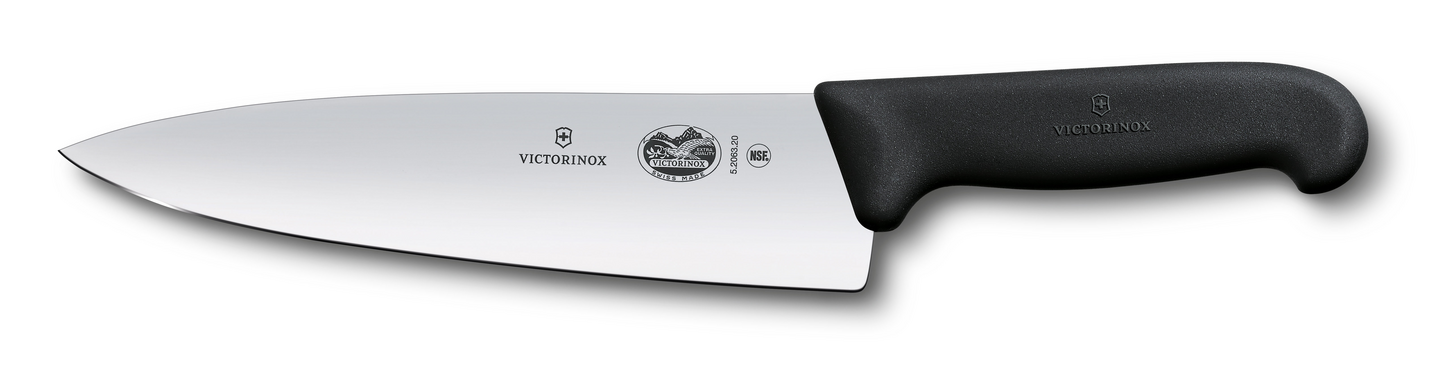 Laadukas kokkiveitsi on sekä ammatti- että kotikokin tärkein työväline ja jokaisen keittiön yleisveitsi. Tämä keskikokoinen kokkiveitsi sopii monenlaiseen pilkkomiseen, koska terän pituus riittää hieman kookkaampienkin raaka-aineiden käsittelyyn. Tavanomaista leveämmän terän ansiosta leikkuualustan ja käden väliin jää enemmän tilaa ja leveällä lappeella esimerkiksi valkosipulien murskaaminen on helppoa. Terä on valmistettu ensiluokkaisesta, tarkoitukseensa parhaalla mahdollisella tavalla sopivasta terässeoksesta. Lopputuloksena on kestävä veitsi, joka pysyy pitkään terävänä teroitusten välillä. Hygieeninen Fibrox-kahva on muotoiltu ammattikäytön ergonomiavaatimukset huomioiden ja luistamattomana siitä saa turvallisen, pitävän otteen jopa märillä käsillä. Terän pituus: 20 cm. Materiaali: TPE, ruostumaton teräs.