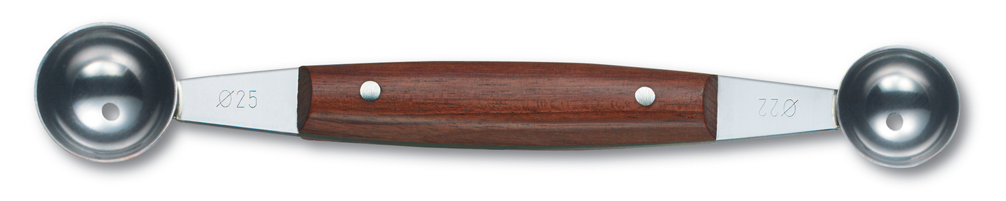 Kaksipäisen palloraudan avulla pallojen muotoilu onnistuu esimerkiksi melonista, jäätelöstä ja perunamuusista. Kuppien halkaisijat 2,2 cm ja 2,5 cm. Kahvan materiaali: luumupuu.