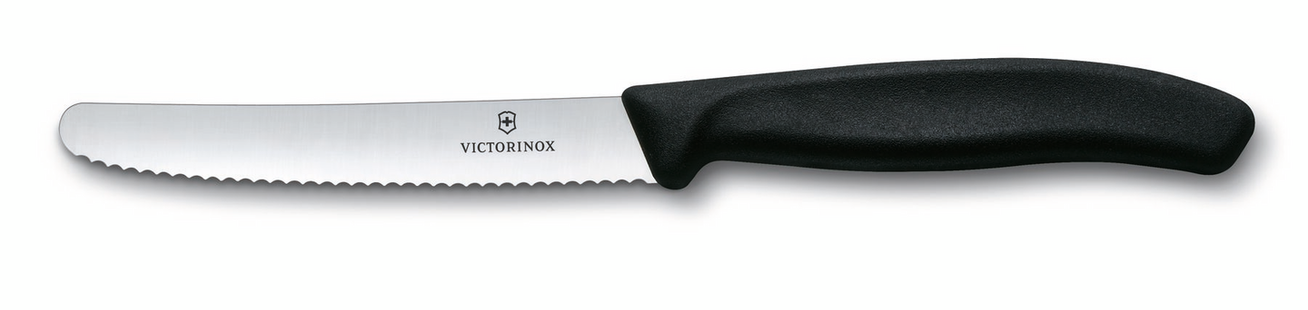 Victorinoxin legendaarinen sahalaitainen tomaattiveitsi sopii monenlaiseen käyttöön aina tomaattien ja muiden mehevien raaka-aineiden viipaloinnista tuoreiden sämpylöiden halkaisuun ja pizzan paloitteluun. Terän pituus 11 cm. Materiaali PP, ruostumaton teräs.