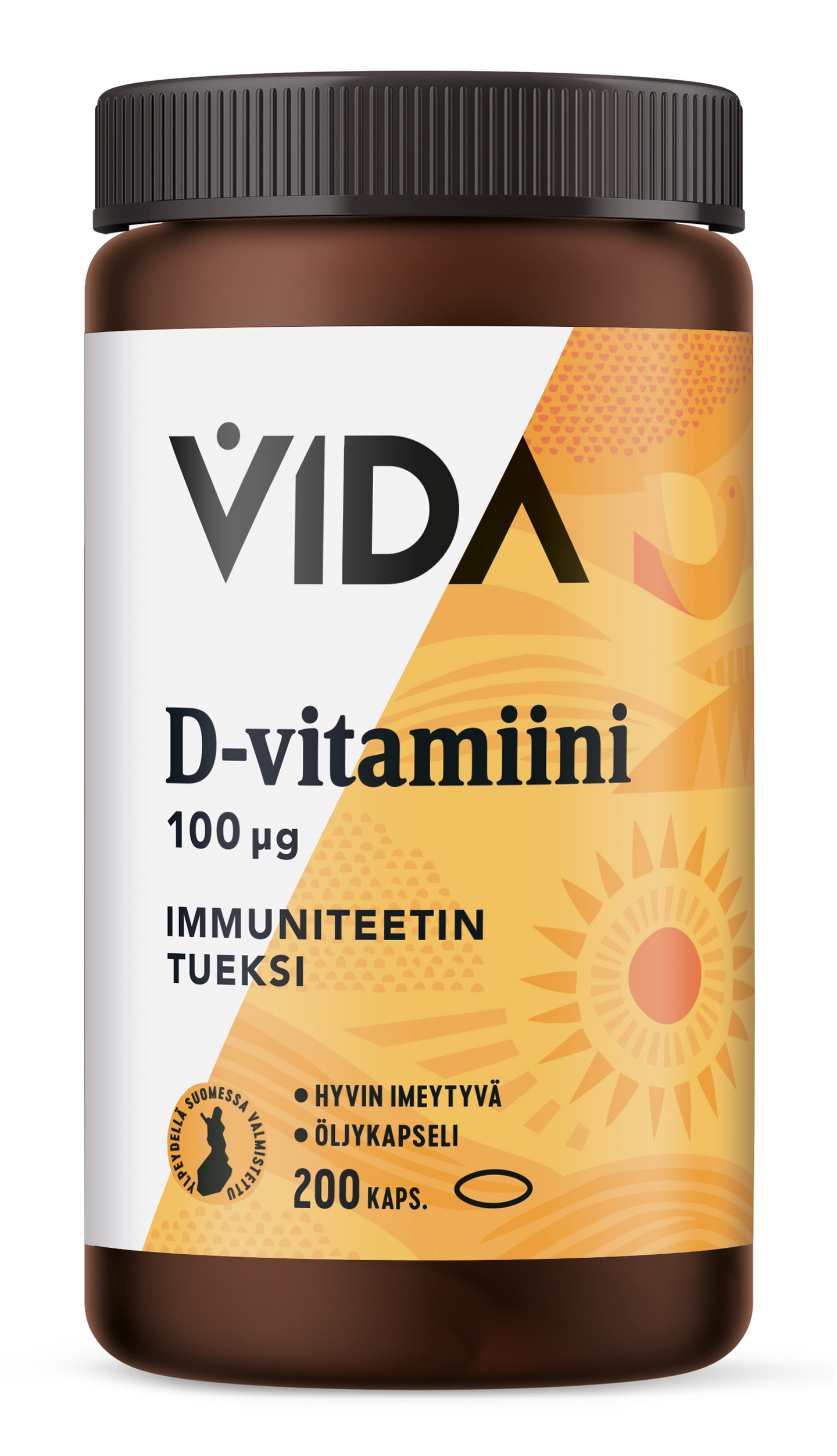 LaktoositonKotimainen Vida D-vitamiini edistää luiden pysymistä normaaleina ja immuunijärjestelmän normaalia toimintaa. Tehostaa kalsiumin imeytymistä. Pienessä helposti nieltävässä kapselissa oleva laadukas extra neitsytoliiviöljy tehostaa D3-vitamiinin imeytymistä.