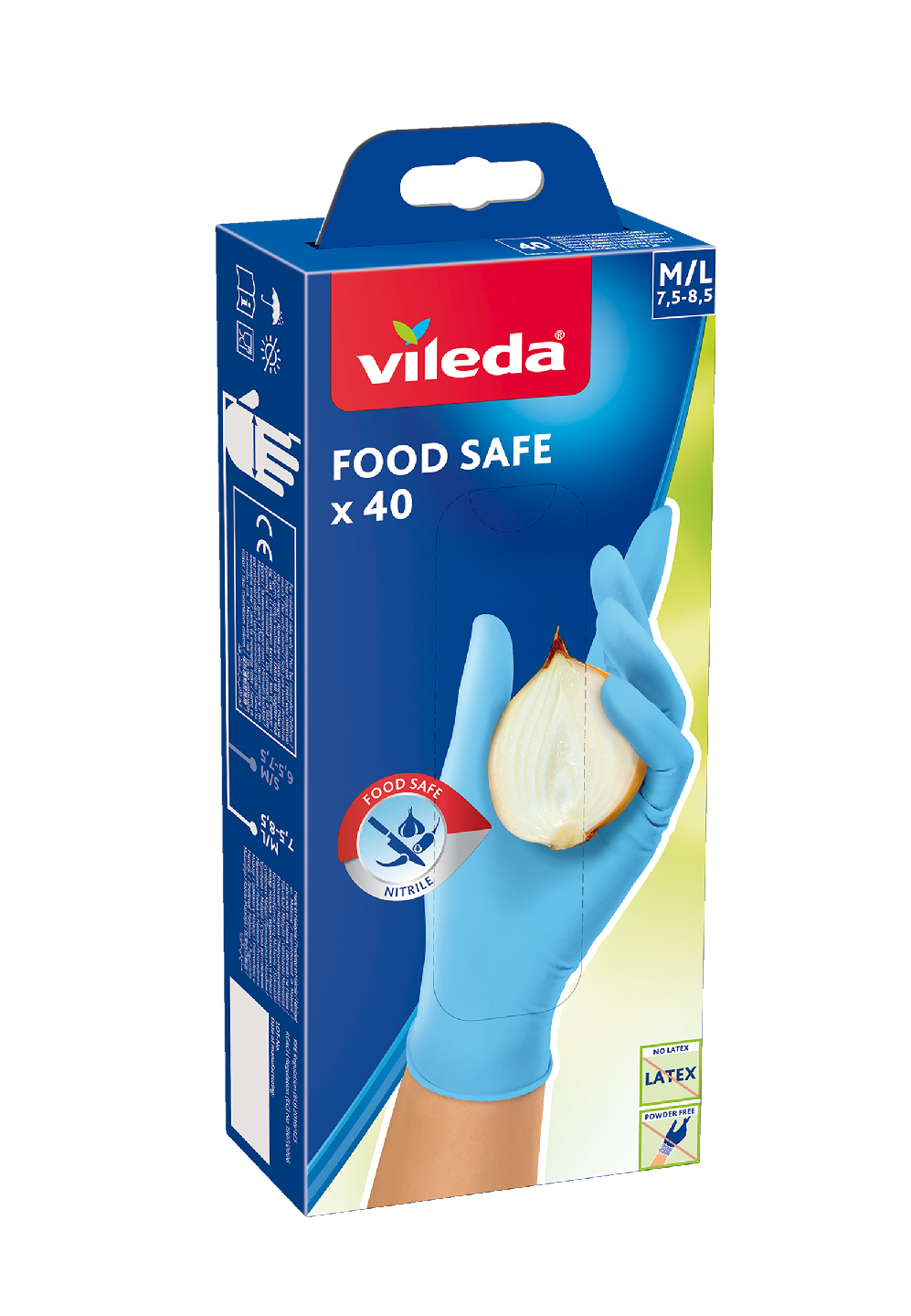 Vileda Food Safe nitriilikertakäyttökäsineet sopivat erityisen hyvin elintarvikkeiden käsittelyyn sekä lateksiallergikoille. Käsineiden materiaali on 100 % puuteroimatonta nitriiliä. Yksi pakkaus sisältää 40 nitriilikäsinettä. Koko M/L.