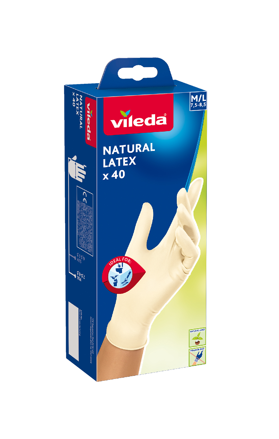 Vileda Natural Latex käsineet on valmistettu luonnonkumista ja ne ovat puuteroimattomat ja hellävaraiset kertakäyttökäsineet, jotka takaavat optimaalisen suojan ja parhaan hygienian käsillesi. Nämä joustavat ja monikäyttöiset käsineet on valmistettu 100% luonnonkumista ja ne käyvät molempiin käsiin, antaen erinomaisen tuntoherkkyyden kuin ne olisivat toinen iho. Pakkauksessa on 40 kappaletta. Koko M/L.