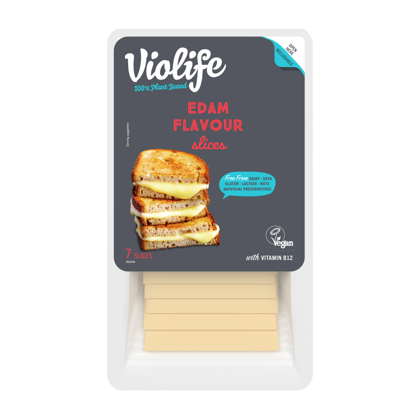 VegaaninenViolife Edam flavoured slices on valmiiksi viipaloitu kasvipohjainen vaihtoehto juustolle, joka sopii paahtoleivän, hampurilaisten tai voileipien päälle sellaisenaan. Se sulaa erinomaisesti lämmitettäessä ja siinä on herkullinen Edamin maku. 100 % kasvipohjainen eikä se sisällä maitoa, laktoosia, soijaa, gluteenia, pähkinöitä tai keinotekoisia säilöntäaineita.