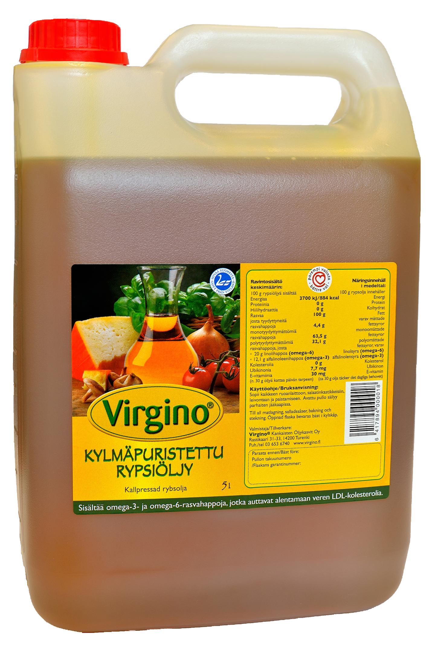 GluteenitonKorkealaatuinen kylmäpuristettu Virgino on 100% kotimainen ja tutkitusti terveellinen vaihtoehto päivittäiseen käyttöön. Kylmäpuristettu rypsiöljy sisältää runsaasti terveydelle tärkeitä ainesosia, kuten omega-3 rasvahappoja, E- ja K-vitamiinia, lesitiiniä sekä ubikinonia luonnollisessa muodossa. Öljy irrotetaan rypsin siemenistä mekaanisesti puristamalla. Siemeniä ei kuumenneta eikä käsitellä kemiallisesti. Kylmäpuristettu Virgino sopii kaikkeen ruuanlaittoon ja leivontaan. Virginoa voi sekoittaa puuroon tai pirtelöön. Se on erinomainen pohja marinadeihin ja salaattikastikkeisiin. Rypsille ominainen hieman pähkinää muistuttava maku sopii erityisen hyvin kotimaisten viljojen, juuresten ja marjojen kanssa. Myös kala ja pihvi saavat täyteläisen säväyksen. Korkean savuamispisteensä (+210 C°) ansiosta öljy soveltuu mainiosti pannulla paistamiseen sekä uppopaistamiseen.