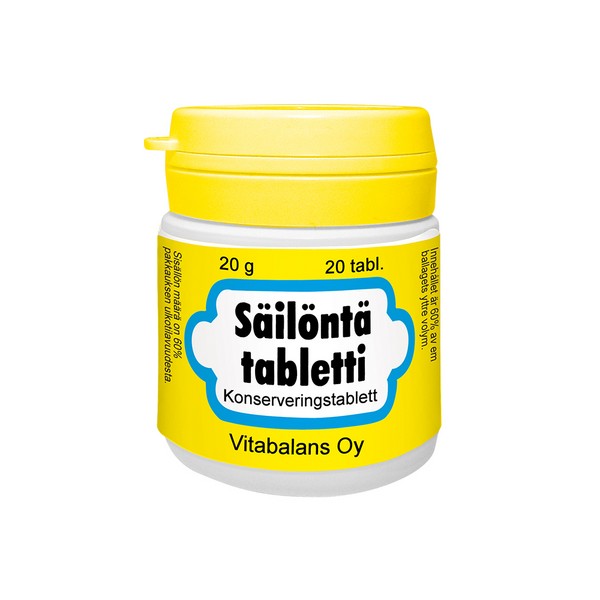 Säilöntätabletti on helppo tapa säilöä kesän maku. Se sopii erinomaisesti marja-, hedelmä- ja kasvissäilykkeiden tekemiseen. Sen avulla saat helposti säilöttyä kesän ravintoaineet ja maut odottamaan myöhempiä herkkuhetkiä. Pakkauksessa on säilöntäohjeita marja-, hedelmä-, sieni- ja vihannessäilykkeiden tekemiseen.