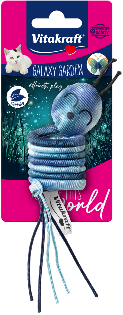 Spiraalinmuotoinen pieni matomme ryömii luoksesi muukalaisgalakseista pitääkseen kissasi kiireisenä. Joustava, pehmeä runko ja pää leikkiä stimuloivalla kissanmintulla tarjoavat leikin aikana galaktisia hetkiä, joita värikkäät lepattavat nauhat täydentävät. Elastinen mato kissanmintulla. Polyesteria. Runko integroidulla muovispiraalilla. Lepattava nauha. N. 16 cm pitkä.