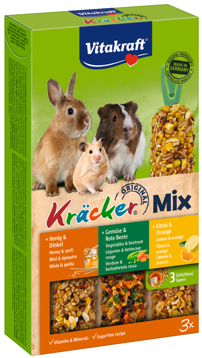 Vitakraft® Kräcker® on puhdasta makua ja lajikohtaista touhua yhdessä, koska jyrsijät työstävät itse ruokansa. Kolme herkullista luonnonpuulle paistettua kerrosta takaavat erityisen pitkän napostelun ja hampaiden hankauksen.