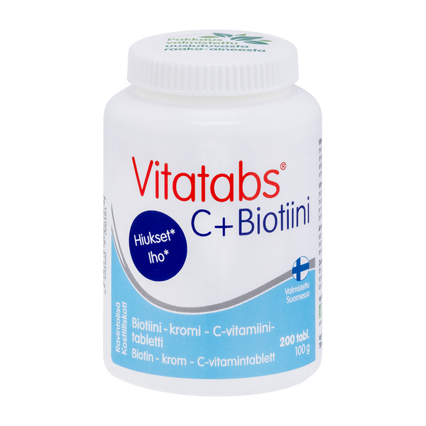 VegaaninenVitatabs® C + Biotiini -ravintolisä hiusten, kynsien ja ihon hyvinvoinnille. Biotiini edistää hiusten, ihon ja limakalvojen pysymistä normaaleina, C-vitamiini kollageenin muodostumista ihon normaalia toimintaa varten. Ei sisällä eläinperäisiä ainesosia. Annostus: 3 tablettia päivässä. Laktoositon, hiivaton, gluteeniton. Valmistettu Suomessa.
