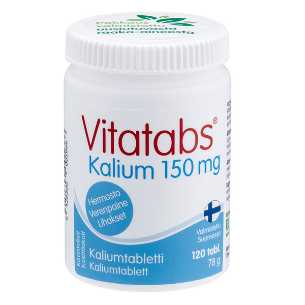 VegaaninenVatsaystävällinen Vitatabs Kalium sisältää kaliumia sitraattimuodossa 150 mg/tabletti. Kalium on tärkeä kivennäisaine, joka edistää hermoston ja lihasten normaalia toimintaa sekä verenpaineen pysymistä normaalina. Annostus: 1 tabletti enintään 4 kertaa päivässä. Laktoositon, hiivaton, makeuttamaton, gluteeniton. Ei sisällä eläinperäisiä ainesosia. Valmistettu Suomessa.