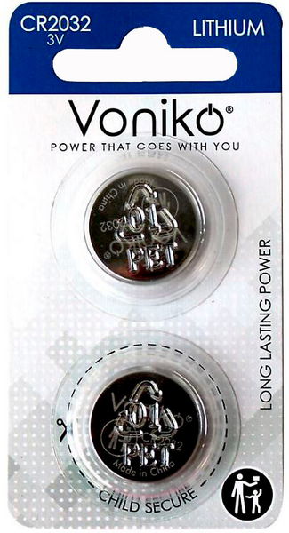 Voniko litiumparisto 2 kappaleen pakkauksessa. Tyyppi: CR2032. Jännite: 3 volttia. Paino: 3,2g. Mitat: halkaisija: 20mm, korkeus 32mm. Säilyvyys: 5 vuotta valmistuspäivästä. Käyttölämpötilat: -10°C - +60°C.