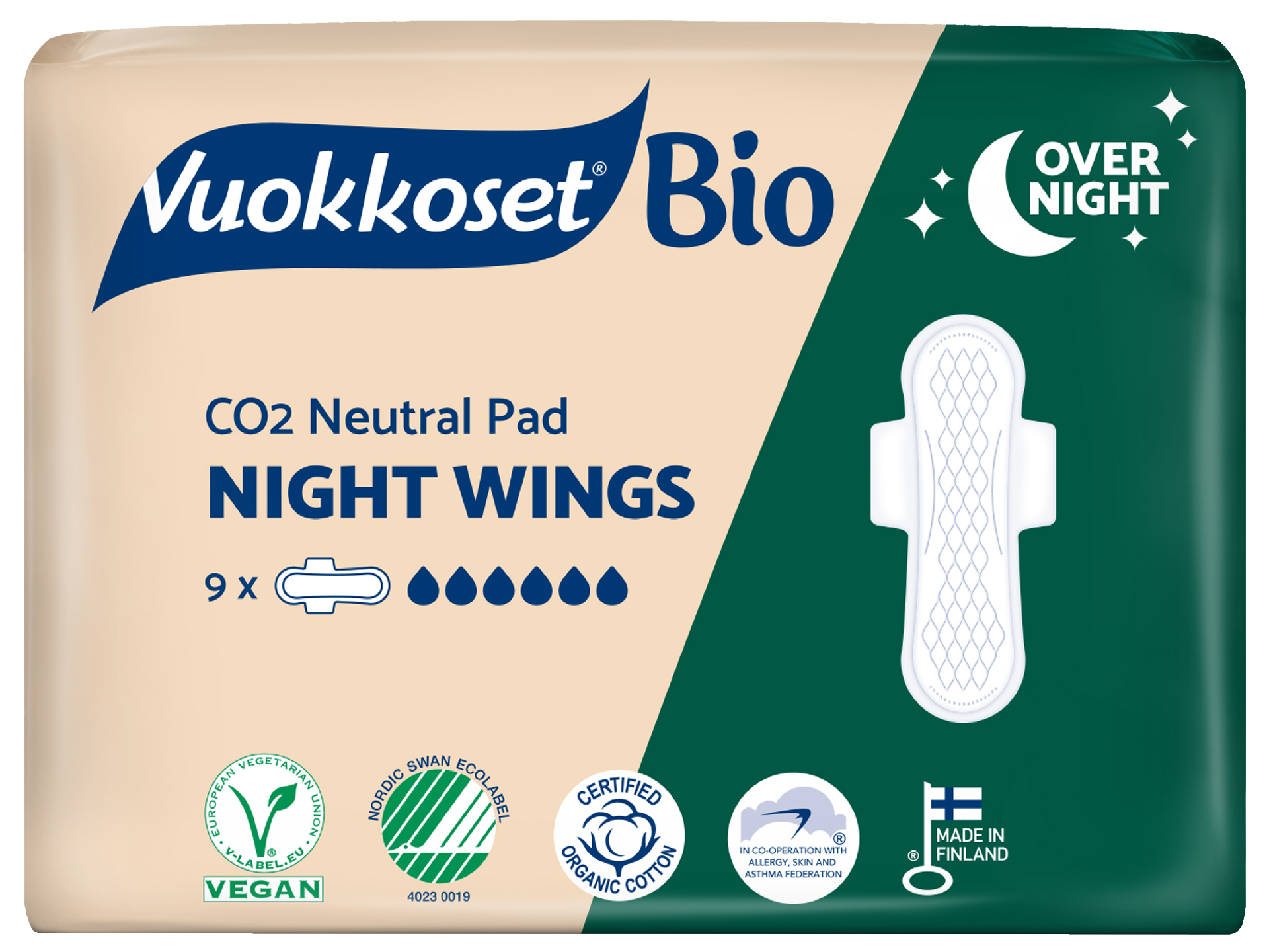 Vuokkoset-tuotteet ovat nyt täysin hiilineutraaleja! Biohajoava ja vegaaninen Vuokkoset Bio Night Wings on miellyttävän pehmeä siivellinen ja erittäin pitkä ohutside yökäyttöön tai muuten runsaaseen kuukautisvuotoon. Reilun pituuden ja hyvän imukyvyn ansiosta se pitää olosi erityisen varmana kuukautistesi aikana riippumatta siitä, mitä teet tai missä olet.