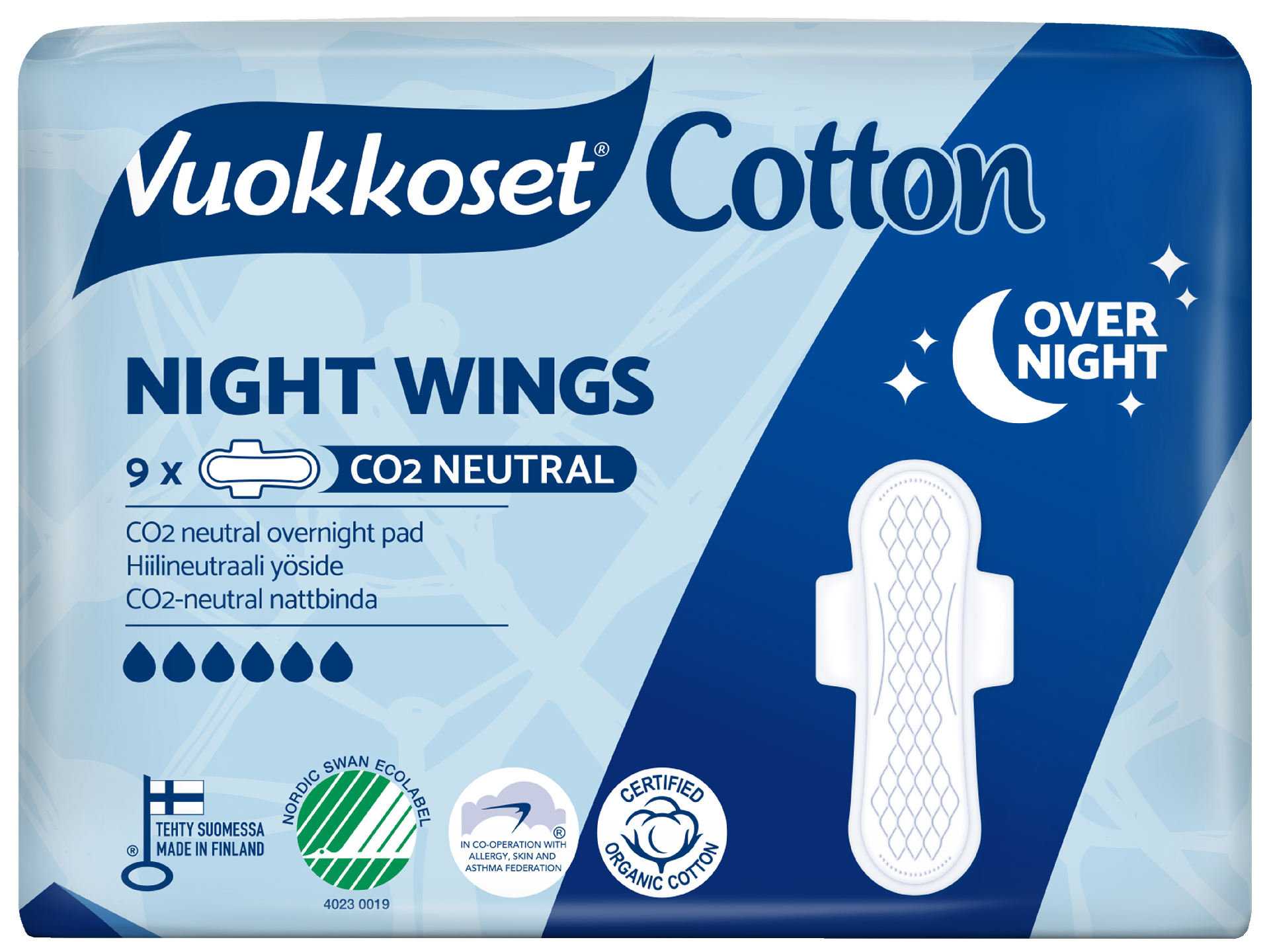 Vuokkoset-tuotteet ovat nyt täysin hiilineutraaleja! Vuokkoset Cotton Night Wings on hellävarainen ja todella imukykyinen, siivellinen ohutside, joka on kehitetty erityisesti yökäyttöön. Yösiteen pinta on aitoa 100% luomupuuvillaa, jonka ansiosta se tuntuu erityisen ihoystävälliseltä ja hengittävältä ihoasi vasten. Vuokkoset Cotton on maailman ensimmäinen naisten hygieniatuotesarja, jolle on myönnetty Allergia-, Iho- ja Astmaliiton tunnus. Kaikki Vuokkoset-ohutsiteet ovat yksittäispakattuja. Tuotteet ovat dermatologisesti testattuja, eivätkä koskaan sisällä hajusteita, tuoksuja, klooria tai muita sinulle turhia kemikaaleja. Kehitetty yhdessä Allergia-, Iho- ja Astmaliiton kanssa. Valmistettu vastuullisesti Suomessa. • varma siivellinen ohutside • imukykyinen, huomaamaton ja pehmeä • hengittävä luomupuuvillainen pintakerros, ei haudo ihoa • dermatologisesti testattu • hajusteeton, väriaineeton, klooriton, hellä iholle • kehitetty yhteistyössä Allergia-, iho- ja astmaliiton kanssa • Avainlippu- ja Joutsenmerkitty tuote • kotimainen