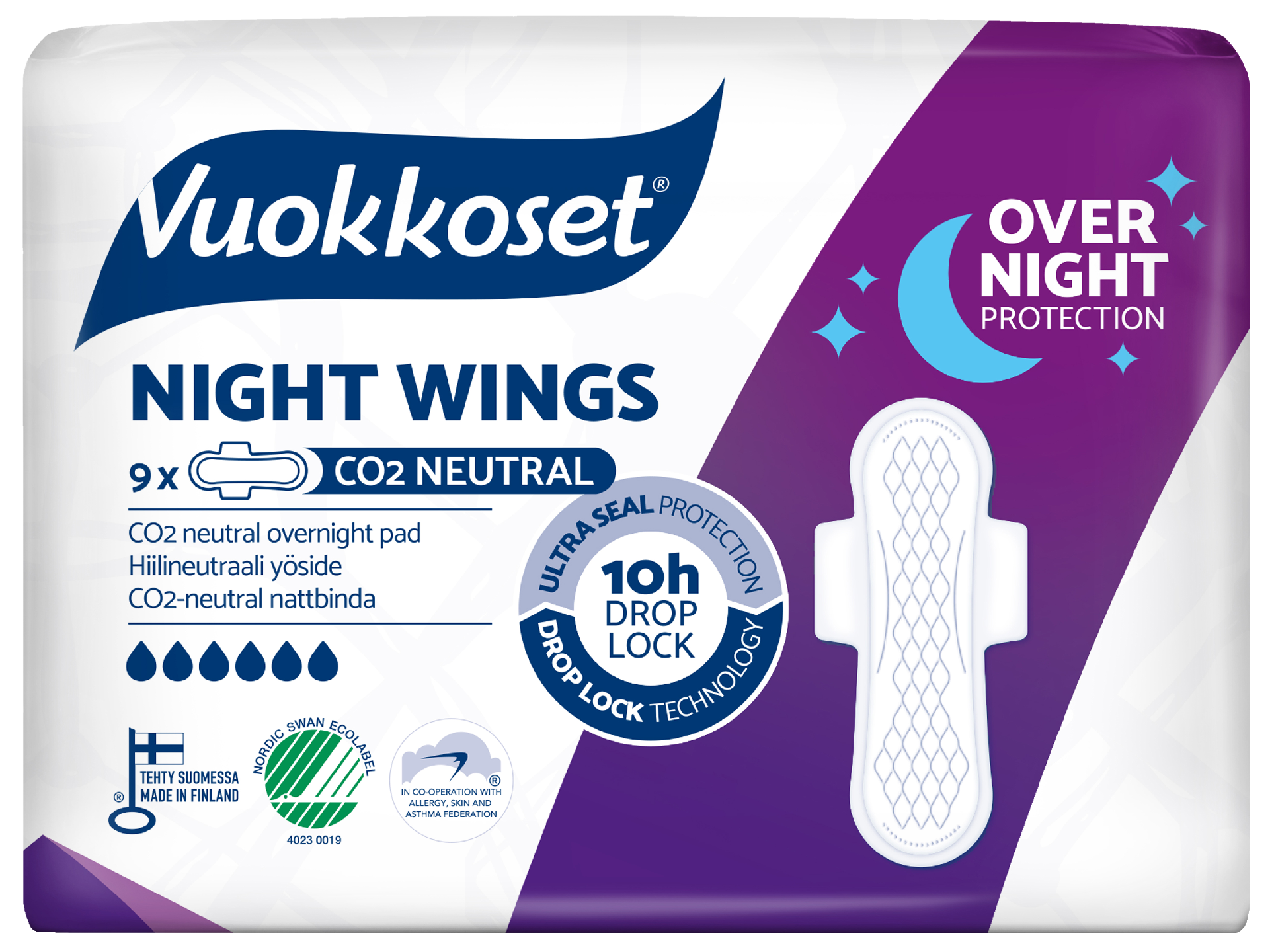 Vuokkoset-tuotteet ovat nyt täysin hiilineutraaleja! Vuokkoset Night Wings, reilusti pidempi siivellinen ohutside, jossa Drop Lock takaa varman imukyvyn.