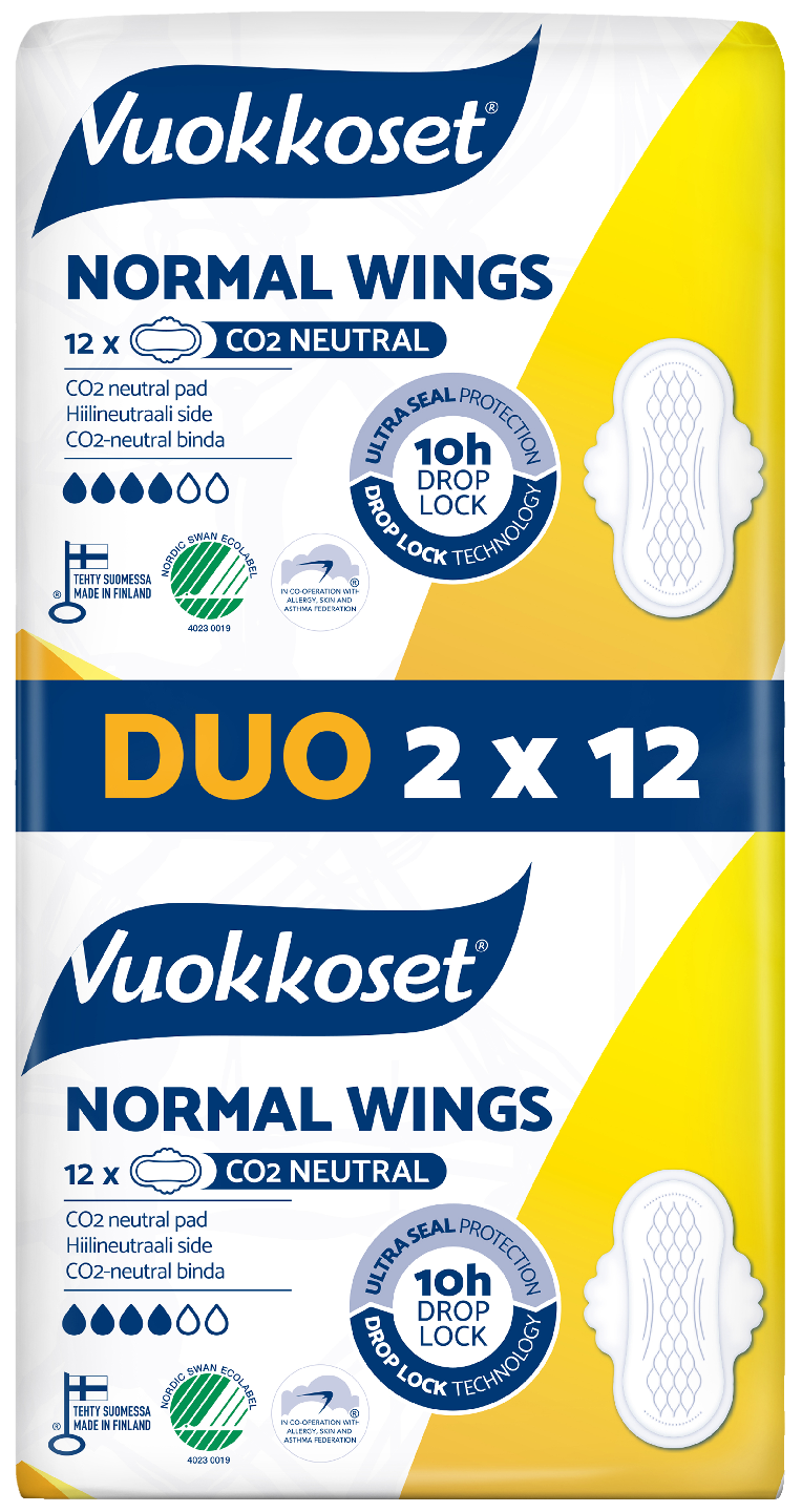 Vuokkoset-tuotteet ovat nyt täysin hiilineutraaleja! Vuokkoset Normal Wings, siivellinen ohutside, jossa Drop Lock takaa varman imukyvyn.