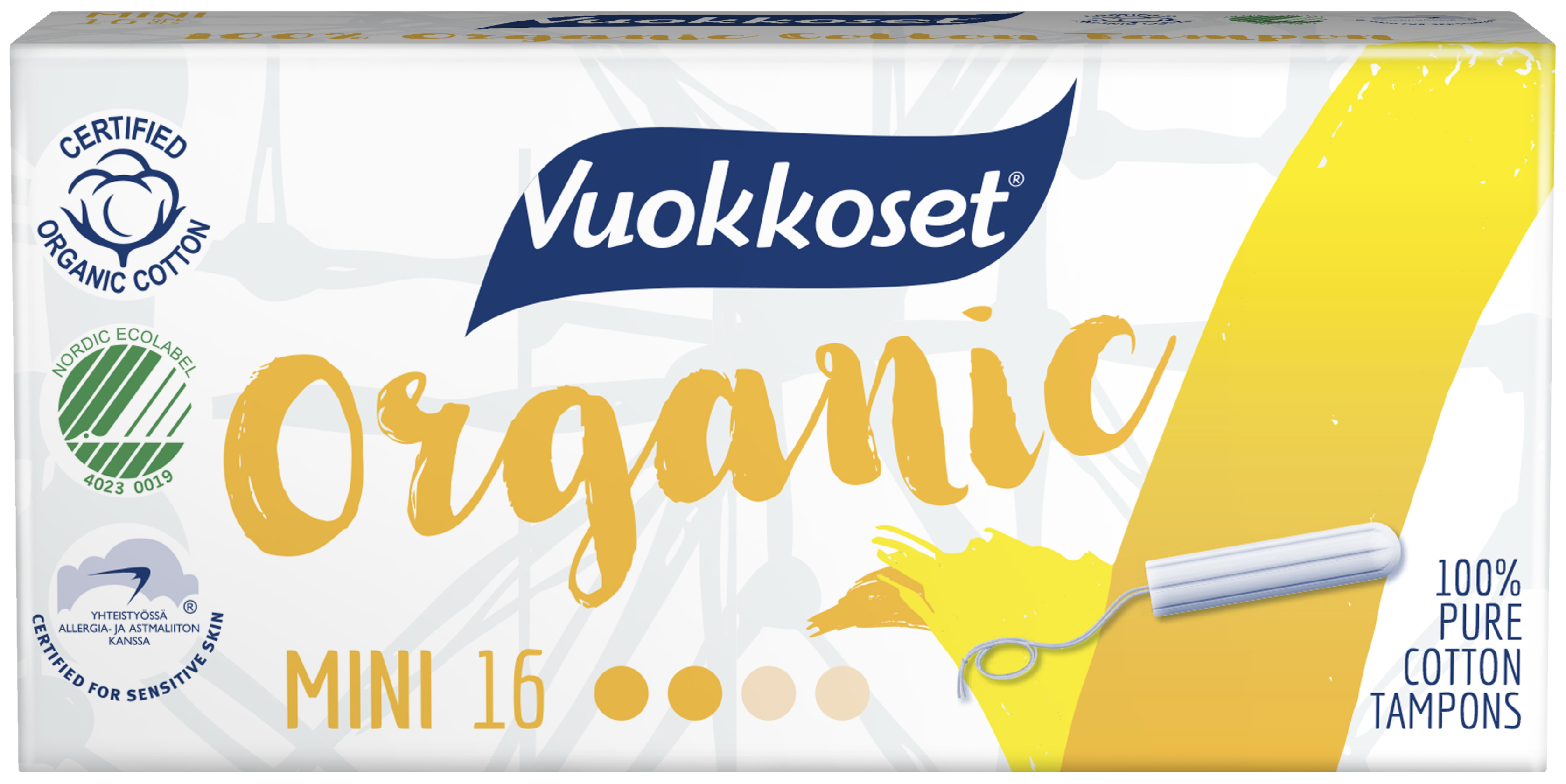 Vuokkoset Organic -tamponit ovat täysin biohajoavia ja tamponin voikin käytön jälkeen kompostoida. Vuokkoset Organic -tamponit ovat Joutsenmerkittyjä, sekä kehitetty yhteistyössä Allergia-, Iho- ja Astmaliiton kanssa.