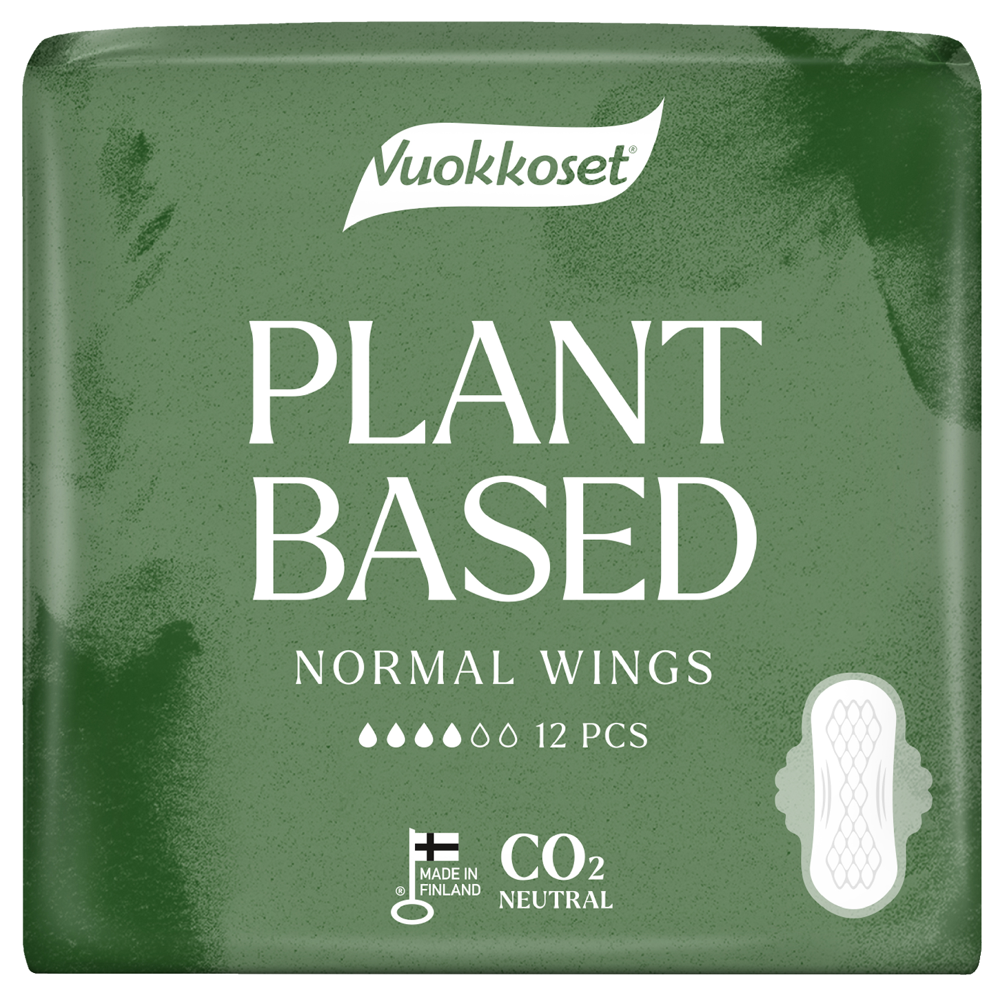 Vuokkoset Plant Based Normal Wings side on ekologinen ja imukykyinen kuukautissuoja, jonka CO2-päästöt ovat luonnostaan pienemmät. Vuokkoset Plant Based on valmistettu luonnollisista ja uusiutuvista raaka-aineista, mikä tekee siitä ympäristöystävällisimmän vaihtoehdon perinteisille, neitseellistä muovia sisältäville kertakäyttösille kuukautissuojille. Tuotteen pehmeä pintamateriaali on luomupuuvillaa, tehokas imuydin on kloorivalkaisematonta selluloosaa ja taustakalvo sokeriruo'osta.