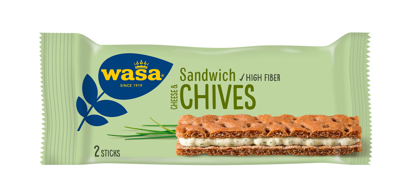 Wasa Sandwich Chives on täysjyvärukiista leivottu valmis välipalatuote, jossa on ruohosipulia ja juustoa sisältävä täyte. Pakkaus sisältää kaksi sandwich-patukkaa – täydellinen välipala mukaan otettavaksi!
