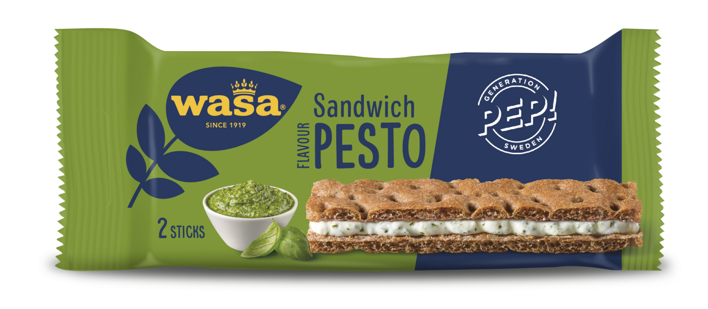 Wasa Sandwich pesto on kaksi ruisnäkkileipäpatukkaa, joissa juuston ja peston makuinen täyte.