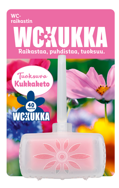 WC Kukka Kukkaketo wc-raikastin puhdistaa wc-altaan ja antaa miedon miellyttävän tuoksun jokaisella huuhtelukerralla. WC-raikastin ennaltaehkäisee kalkin muodostumista auttaen näin WC-allasta pysymään puhtaana pidempään.