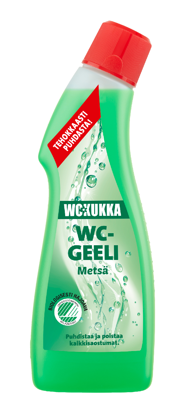WC Kukka wc-geeli on tehokas ja riittoisa puhdistusaine, joka puhdistaa wc-altaan tehokkaasti. Poistaa lian ja kalkkisaostumat. Käyttöä helpottaa käytännöllinen kaatonokka. Joutsenmerkitty ja biologisesti hajoava. Tuoksuna raikas metsä.