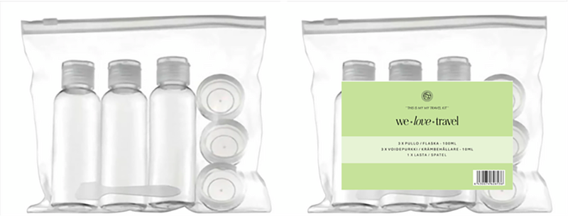 We Love Travel Tyhjiä matkakokoisia pulloja ja purkkeja sisältävä setti 1kpl