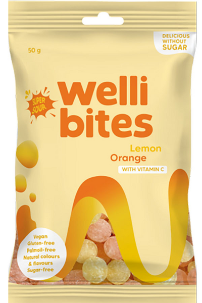 Wellibites Super Sour Lemon & Orange sokeriton makeispussi 50g