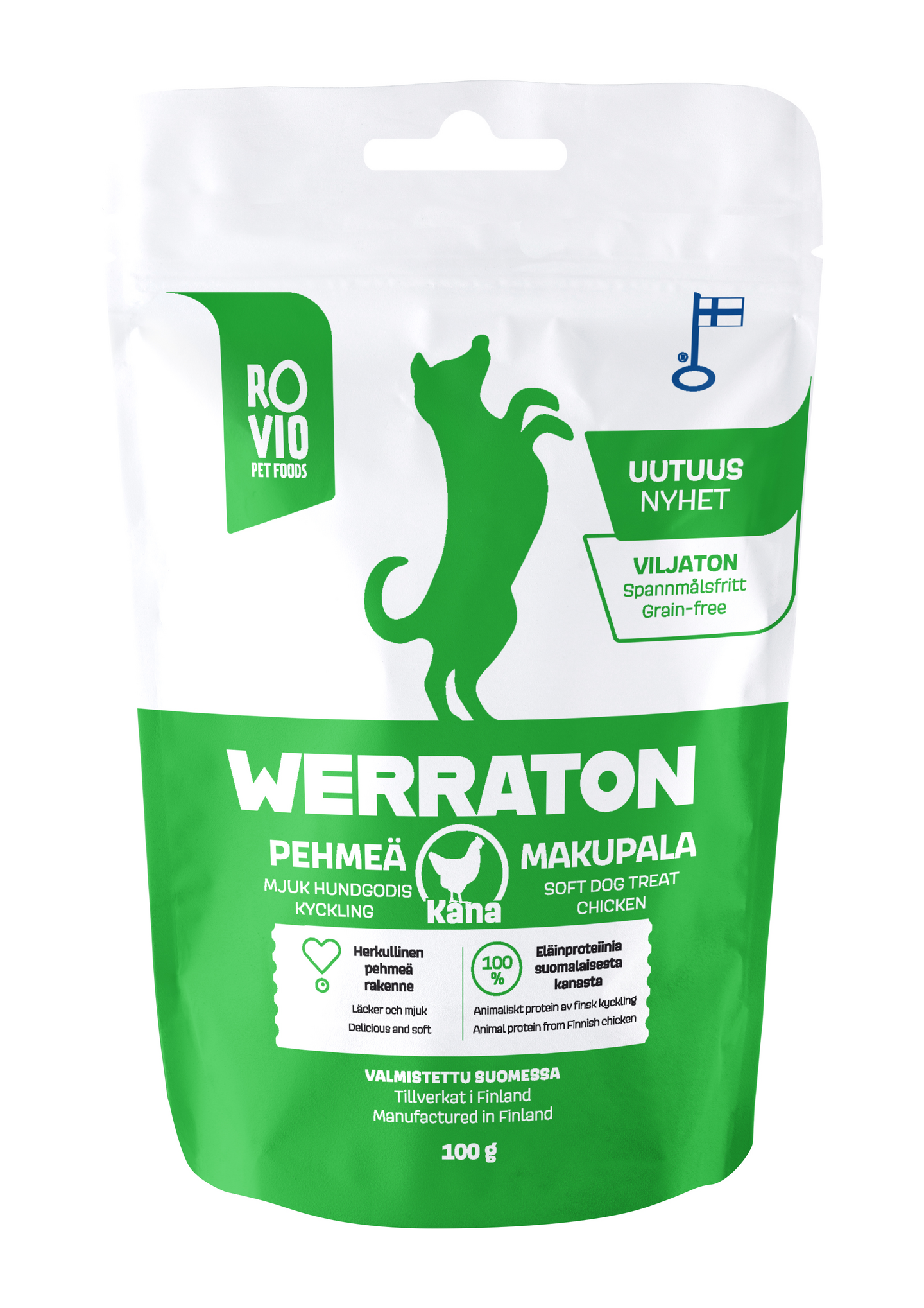 WERRATON PEHMEÄ MAKUPALA on ravinteikas ja maukas herkku aikuiselle koirallesi. Tuote sisältää Werraton-tuotteille tunnusomaisesti hyviä proteiineja tuoreesta kananmunasta ja kanasta. Lisäksi makupala sisältää kotimaista perunaa sekä luonnon omia antioksidantteja arktisista marjoista. WERRATON PEHMEÄ MAKUPALA valmistetaan Rovio Pet Foodsin omassa tehtaassa Loimaalla puhtaista, kotimaisista raaka-aineista.